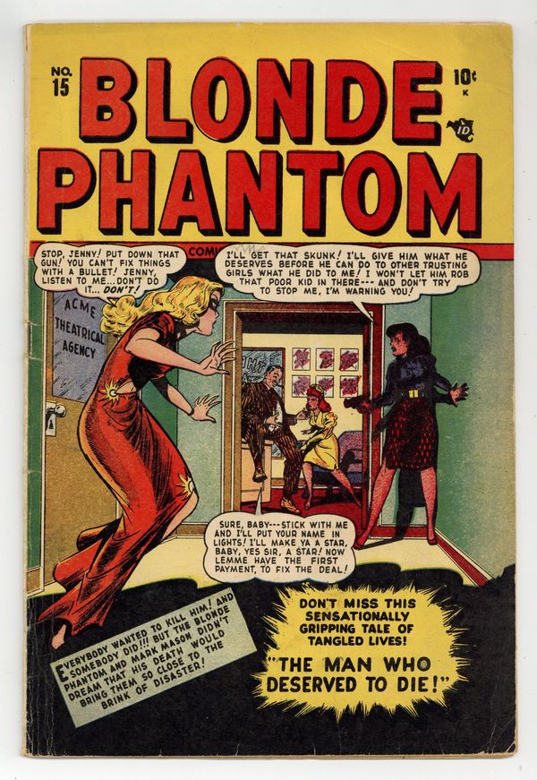 Cover by Syd Shores. Stories by Alan Sulman, Harvey Kurtzman (Hey Look! 1-pager) and unknown. Art by Syd Shores, Harvey Kurtzman (Hey Look! 1-pager), Vince Alascia and unknown. Everybody wanted to kill him! And somebody did! But the Blonde Phantom and Mark Mason didn't dream that his death would bring them so close to the brink of disaster! Don't miss this sensationally gripping tale of tangled lives..."The Man Who Deserved to Die" with splash page pencils by Syd Shores. Also: the Blonde Phantom in "I Hate Me!" with story by Alan Sulman and pencils by Syd Shores; the Blonde Phantom in "Glamour Can Be Fatal" (includes 1st appearance of villain Porky) with art by Syd Shores and Vince Alascia; untitled Hey Look! 1-pager by Harvey Kurtzman; and 2-page text story "Blazing Glory"! Plus: the Sub-Mariner in "Death Deals in Stamps!" (spoiler warning) - "Pirate" Fletcher, a waterfront cafe owner who dresses like a pirate, offers to buy the stamp collection of "Father Time" the lighthouse keeper, but when the old man refuses to sell, Fletcher shoots him and steals the stamps. As he lay dying, "Father Time" uses the stem of his pipe to etch a skull and crossbones on the floor. When Namor and Namora pay the lighthouse keeper a visit, they find his dead body and the clue, and immediately suspect "Pirate" Fletcher. A quick visit to Fletcher's cafe confirms their suspicion as they catch "Pirate" selling the stamps to a shady stamp dealer. Characters in this story: Sub-Mariner [Namor]; Namora; "Father Time" (lighthouse keeper, introduction, death); "Pirate" Fletcher (villain, introduction); Arnold Rankin (villain, stamp dealer, introduction). 32 pages, full color. Cover price $0.10.