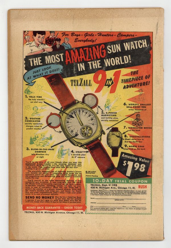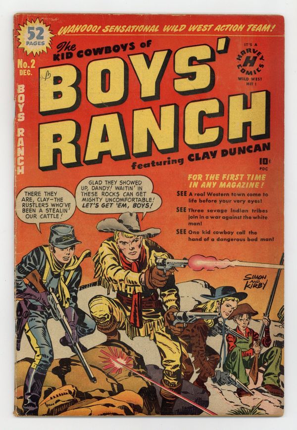 Cover by Jack Kirby and Joe Simon. Stories and art by Mort Meskin, Joe Simon and Jack Kirby. This kid-gang series set in the Old West is often hailed as a creative high-point in the partnership of Joe Simon and Jack Kirby. The origin of the kid cowboys' mentor, Clay Duncan. Raised by Apaches as an adopted son of Geronimo, Clay becomes a frontier scout before going to work for the Boys' Ranch. Also featuring a 2-page map by Kirby of the neighboring town called Four Massacres, and lessons for readers on how to ride, rope and even talk like cowboys. Lead Will Fly at Sunset; How Cowboys Say It; How To Ride a Horse, Lesson 2; Four Massacres; The Original Cowboys; Apache Justice; The Clay Duncan Story!; How to Spin a Rope, Lesson 2. 52 pages, four color. Cover price $0.10.