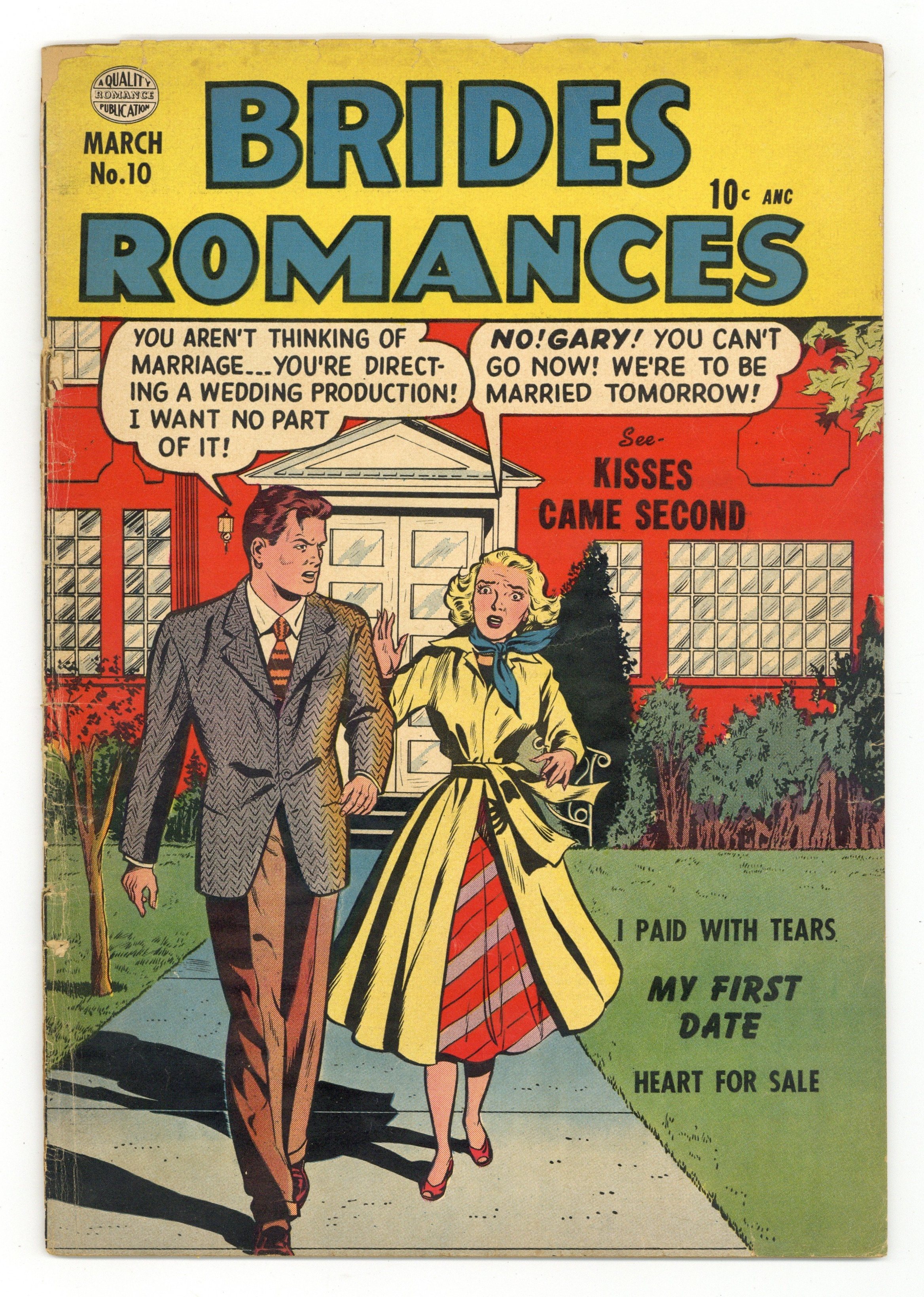 Stories by unknown. Art by unknown. Featuring "I Paid With Tears" and "My First Date"! Plus: Jill and Gary were to be married the next day, but she wasn't thinking of marriage - she was directing a wedding production! And he wanted no part of it! Don't miss the reprint story "Kisses Came Second"! Also featuring the reprint story "Heart for Sale"! And: 1-page text story "Who Is My Love?" 32 pages, full color. Cover price $0.10.