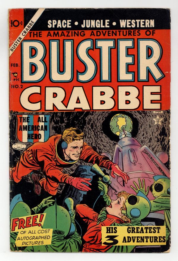 Cover by Alex Toth. Stories and art by Alex Toth, Mike Peppe, John Celardo and Mort Leav. Adventures in space, the Wild West and the jungle with actor Buster Crabbe, famed for playing Flash Gordon. Sometimes listed as The Amazing Adventures of Buster Crabbe #2. Buster boards an eccentric scientist's rocket and winds up on the moon. Buster and company discover a lost city in the jungle, but so do escaped convicts. Featuring art and a great cover by comics legend Alex Toth. Dark of the Moon; The Jungle of Death; Killer On the Loose. 36 pages, Full Color. Cover price $0.10.