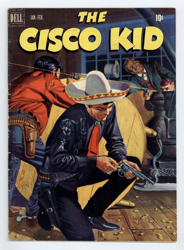 $17.50Painted cover by Ernest Nordli. Art by Bob Jenney. The Cisco Kid rode the range as the Robin Hood of the Old West with his corpulent sidekick Pancho, earning a permanent place in 20th-century pop culture. Just-released outlaw Clint learns that a delayed stagecoach full of gold is being kept in the stage office until the bank opens in the morning. That's the key to his plot to frame the Cisco Kid for murder and robbery. The sheriff enlists Cisco and Pancho in catching the mysterious outlaw known as The Phantom Rider. Plus fun facts about pioneer travel, western transportation, and mule deer. Pioneer Travel; Revenge in Reverse; The Phantom Rider; Western Transportation. 32 pages, Full Color. Cover price $0.10.