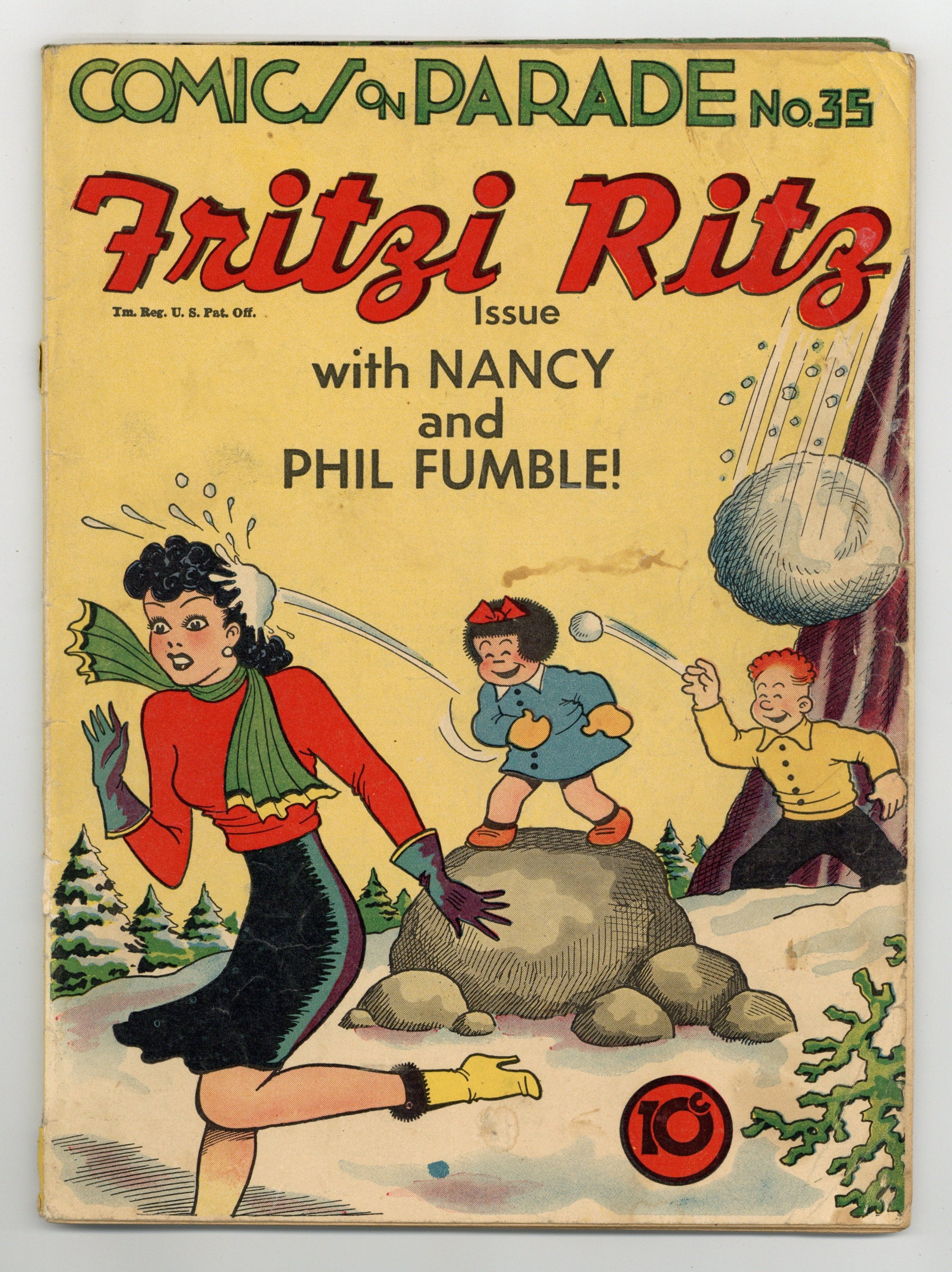 Cover by Ernie Bushmiller. Stories and art by Ernie Bushmiller and Paul F. Berdanier . Sometimes listed as Comics on Parade Vol. 3 #11. Comics on Parade focused on a different United Features comic strip in every issue. This issue features Fritzi, star of Ernie Bushmiller's good-girl strip Fritzi Ritz, and her more famous niece, Nancy. Sluggo leaves his football with the guys when he goes to the movies with Nancy, but maybe that wasn't the best plan. Fritzi figures out how to go to the costume party with Phil Fumble without leaving her little dog behind. How It Began; Fritzi Ritz; Phil Fumble; Hingeing on Stamps; Nancy. 64 pages, Full Color. Cover price $0.10.