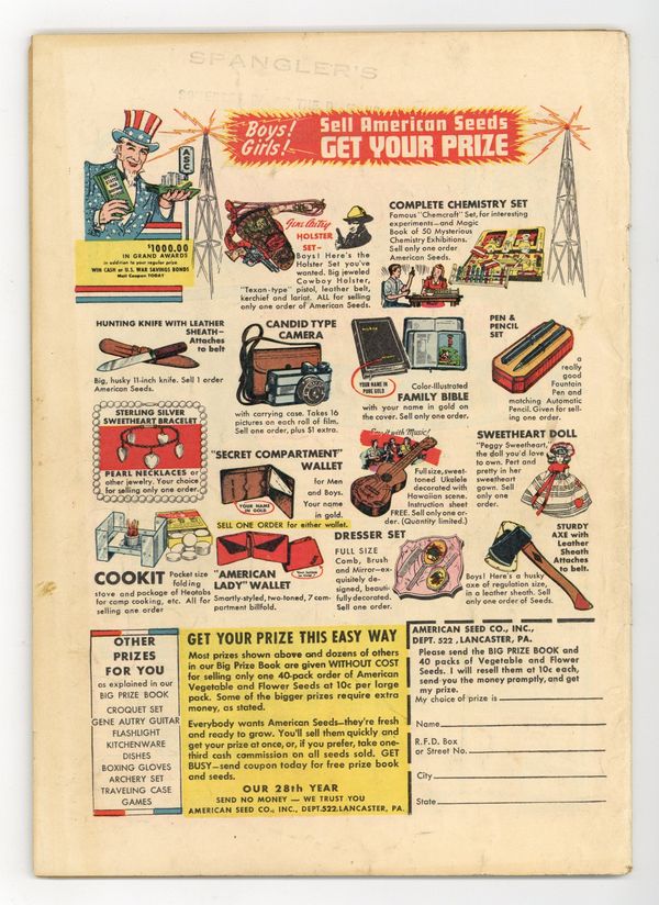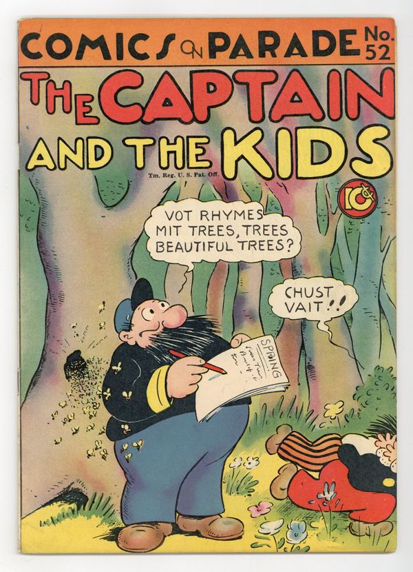 Cover by Rudolph Dirks. Stories and art by Rudolph Dirks and Ed Dodd. Sometimes listed as Comics on Parade Vol. 5 #4. Comics on Parade focused on a different United Features comic strip in every issue. This issue features the iconic pranksters Hans and Fritz and their hapless victim, the Captain. The Captain and the Kids' round-the-world race stops off in India, where they encounter a tiger, an alligator and a cobra - most of whom seem to be pets! The Captain and the Inspector reach the end of their round-the-world race with a slapstick split-second finale. The Captain and the Kids; Stamp Tips; Back Home Again. 48 pages, Full Color. Cover price $0.10.