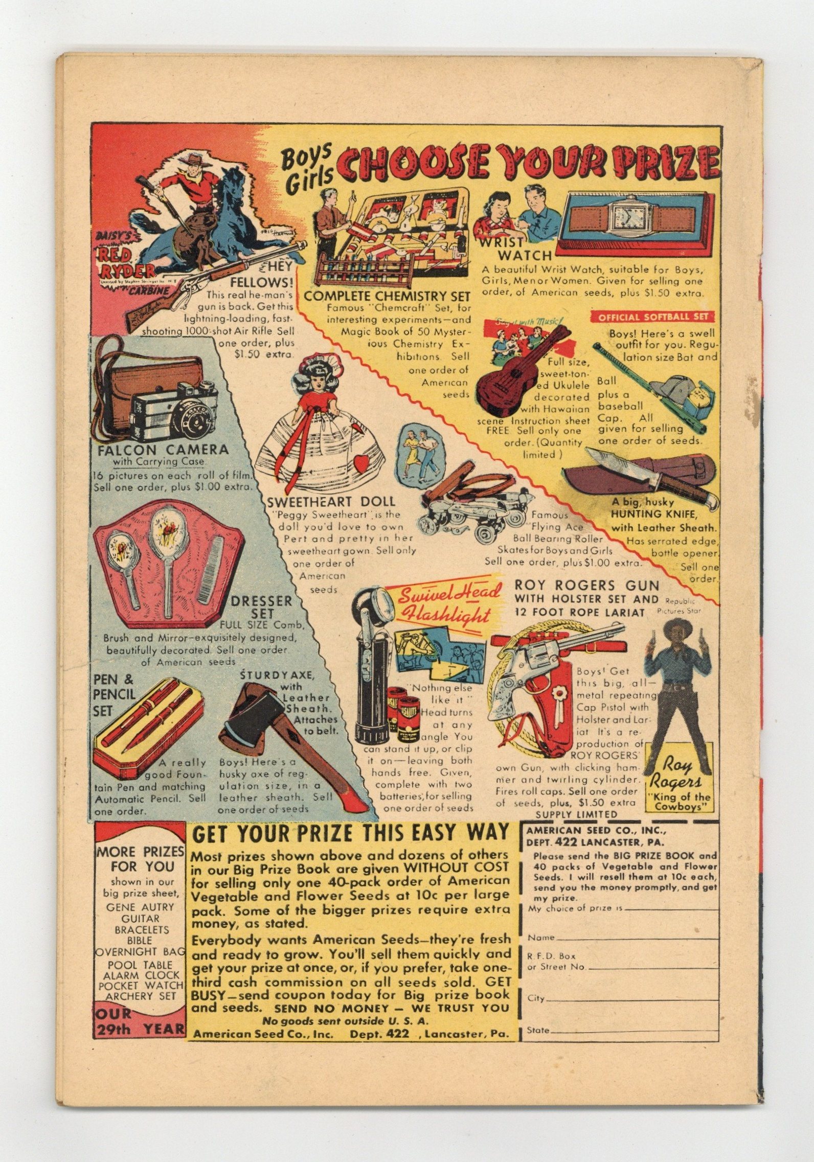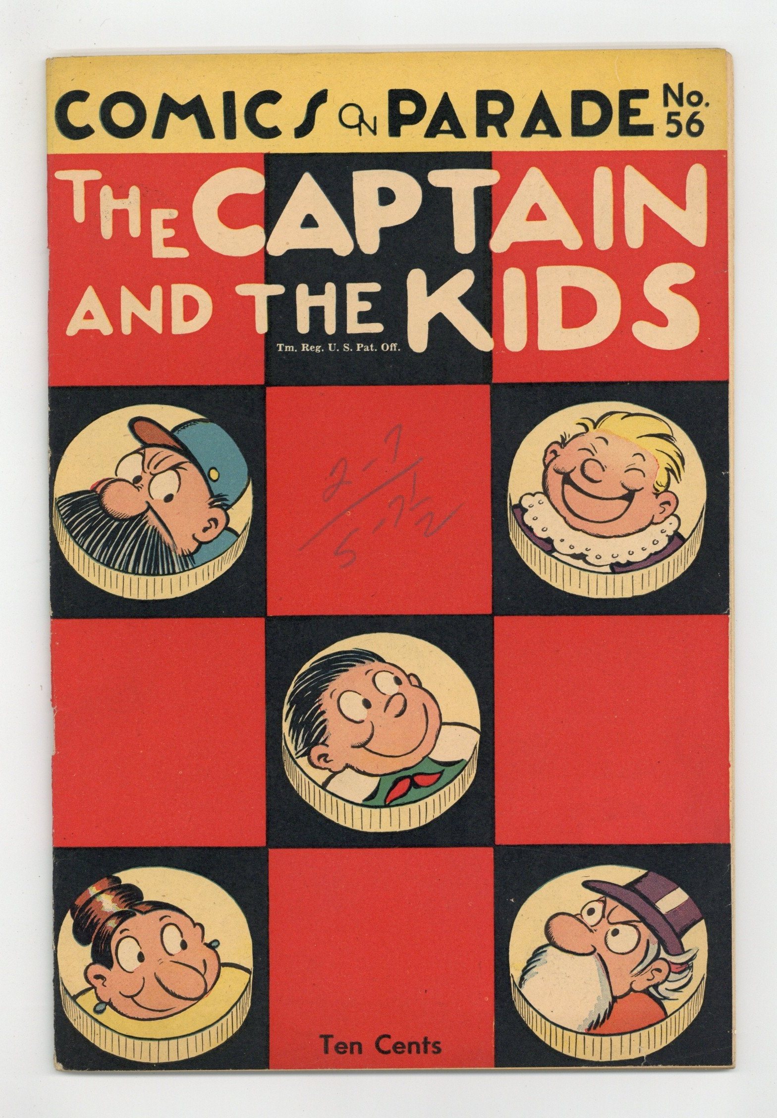 Cover by Rudolph Dirks. Stories and art by Rudolph Dirks and Ed Dodd. Sometimes listed as Comics on Parade Vol. 5 #8. Comics on Parade focused on a different United Features comic strip in every issue. This issue features the iconic pranksters Hans and Fritz and their hapless victim, the Captain. The Kids stow away on a whaling ship, but the sailors are amused when Fritz is carried off by a stork. Fritz has adventures on a remote island continue, as he pranks the bird who abducted him, who then pranks him back. Fritz escapes a lion, and tries to signal the Captain and Mama with the location of the island. The Captain and the Kids; Stamp Tips; The Winged Kidnapper. 48 pages, Full Color. Cover price $0.10.
