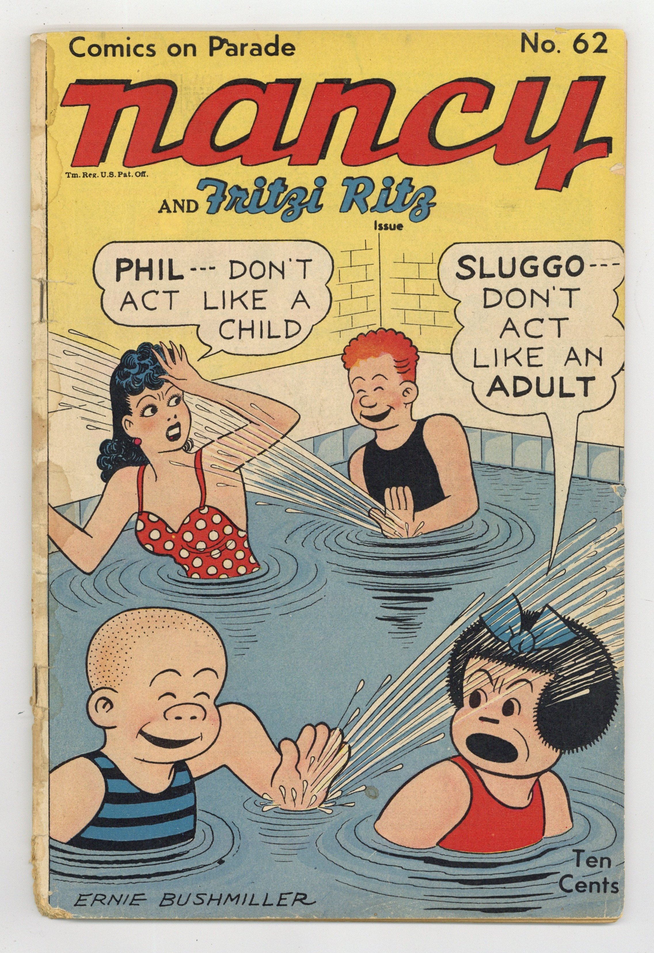 Cover by Ernie Bushmiller. Stories and art by Ernie Bushmiller and Ernest Hix. Sometimes listed as Comics on Parade Vol. 6 #2. Comics on Parade features Fritzi, star of Ernie Bushmiller's good-girl strip Fritzi Ritz, and her more famous niece, Nancy. Phil Fumble realizes Fritzi's watching his girl-watching, in a strip showcasing Bushmiller's good-girl art. Phil finds a way to convince Fritzi that her latest hat is ridiculous. Fritzi's new house looks so much like all the other houses on the block, she keeps going to the wrong one. Fritzi Ritz; Stamp Tips; Nancy; Strange as It Seems. 48 pages, Full Color. Cover price $0.10.