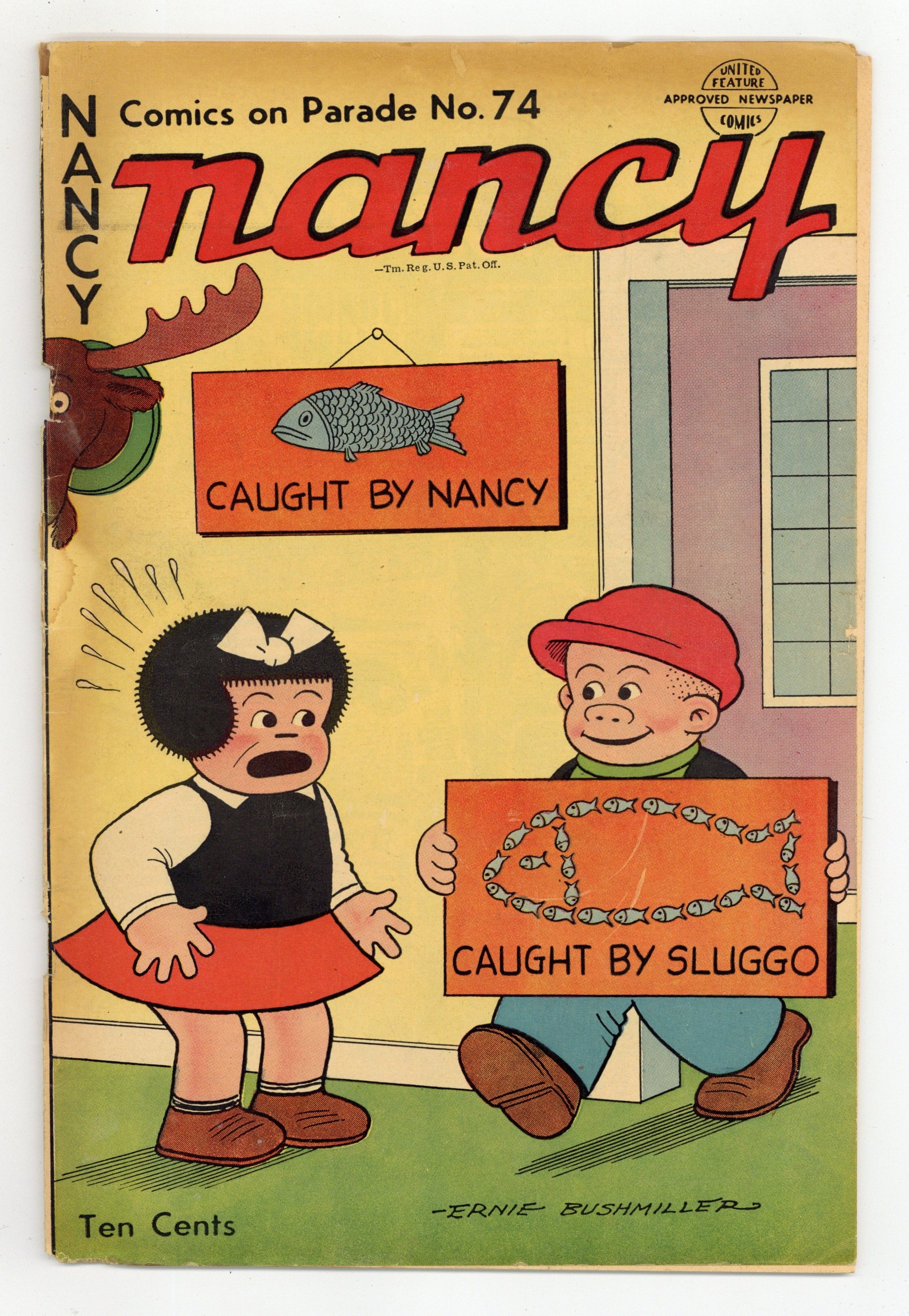 Cover by Ernie Bushmiller. Stories and art by Ernie Bushmiller and others. Comics on Parade features reprints of Ernie Bushmiller's popular Nancy strip, featuring precocious Nancy and her streetwise pal Sluggo. Nancy gives her country cousin Zeb a tour of the city. A rich kid's toy luxury yachts put Nancy and Sluggo's toy boat to shame. Nancy is concerned that the newspaper she's buying isn't up-to-date enough. Plus a vintage ad for a "Life-Like Rubber Skull and Luminous Ghost Mask!" Nancy; Stamp Tips. 32 pages, Full Color. Cover price $0.10.