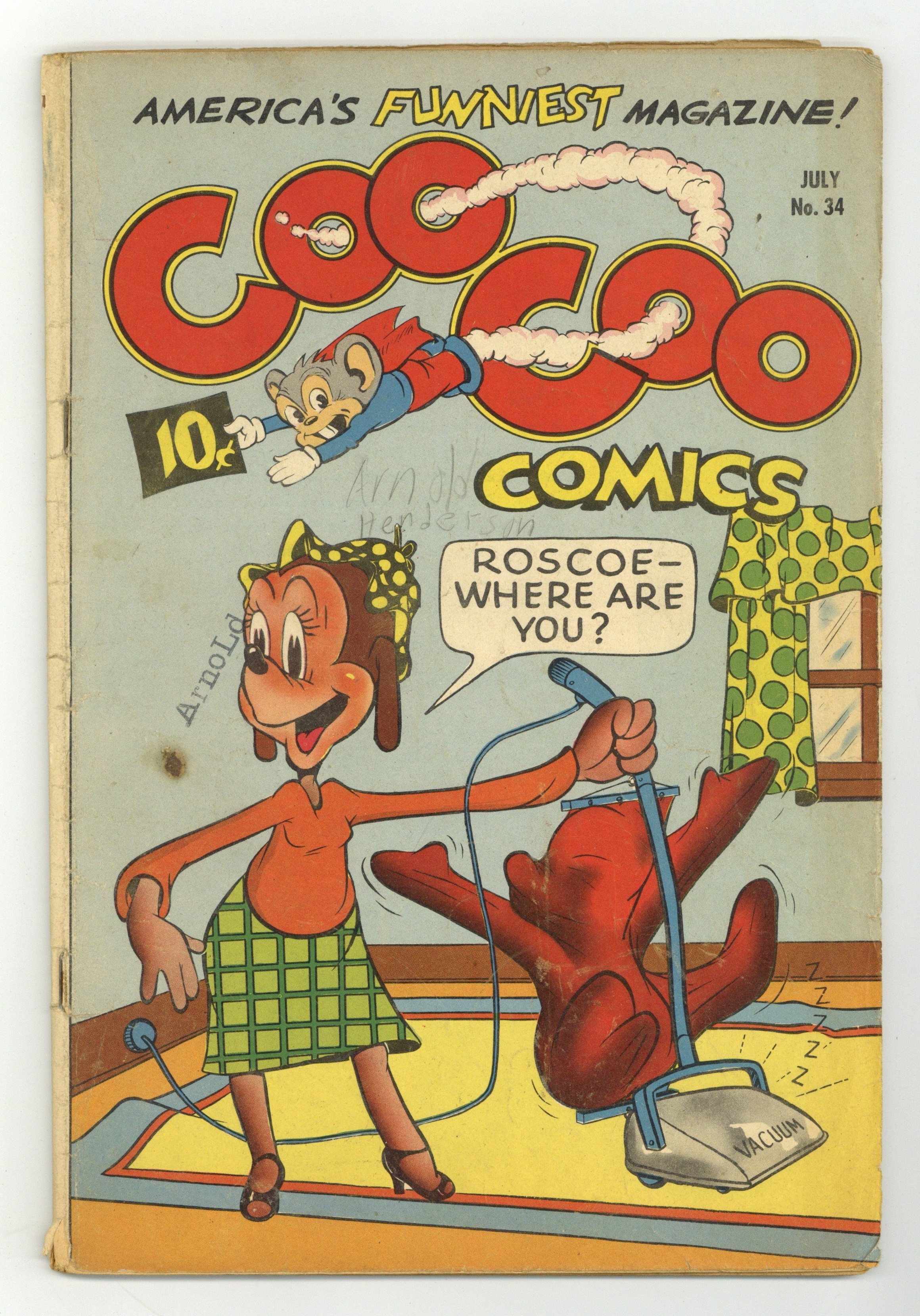 Frank Frazetta illustrations begin; contains three. Frazetta illustrations appear in seventeen consecutive issues of Coo Coo Comics (1942) (#34-50). Contains funny animal stories. In order of appearance: "Supermouse"; "Tuffy" art by Jack Bradbury; "Dodger da Squoil From Brooklyn" story by Jack Cosgriff, art by Al Hubbard; "Samuel Spaniel" art by Lynn Karp; "Bruno Bear"; and "'Hucky Duck" art by Jack Bradbury. Illustrated text stories: "Busy Billy Beaver: The Forest Folk Play Cowboys and Indians!" by Donald Bayne Hobart, illustration by Frank Frazetta; "The Turtle and the Pelican: Tommy Just Couldn't Resist Laughing at Petie!" by Lily K. Scott, illustration by Frank Frazetta; and "Percy the Pufferfish: The Little Creature Longed to Join the Water Circus!" by Alison Leslie, illustration by Frank Frazetta. 52 pages. Full color. Cover price $0.10.
