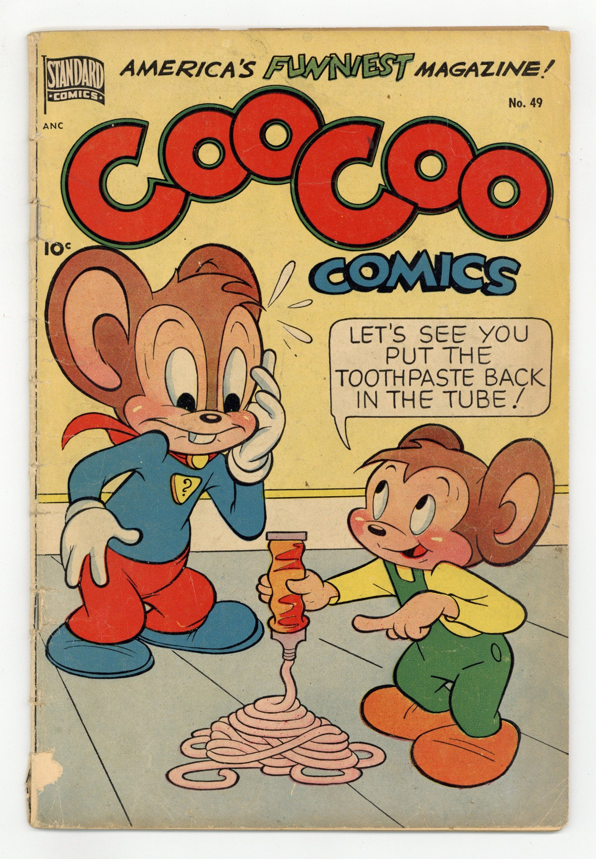 Contains two Frank Frazetta illustrations. Frazetta illustrations appear in seventeen consecutive issues of Coo Coo Comics (1942) (#34-50). Contains funny animal stories. In order of appearance: "Supermouse, 'Soupie Meets Robinson Crusoe'"; "Brownie Bear" art by Ralph Wolfe; "Phineas the Parrot" art by Art Helfant; "Casey the Cat" art by Ralph Wolfe; "Coo Coo in 'Home Sweet Home!'"; "Brownie Bear" art by Ralph Wolfe; "Spunk and Stanley"; "Butch and Buttercup, 'Big Game'" art by Jack Bradbury; "Farmer Billy Goat in 'Rise and Shine!'"; and "Uncle Pigly Tackles the Tackle" art by Lynn Karp. Illustrated text stories: "Forest Hero: This Loud-Talking Creature Certainly Had His Troubles!" by Mickey Klar Marks, illustration by Frank Frazetta; and "Nothing at All: Poor Little Lorji Wanted Friendship and Adventure!" by Elizabeth Starr, illustration by Frank Frazetta. 36 pages. Full color. Cover price $0.10.