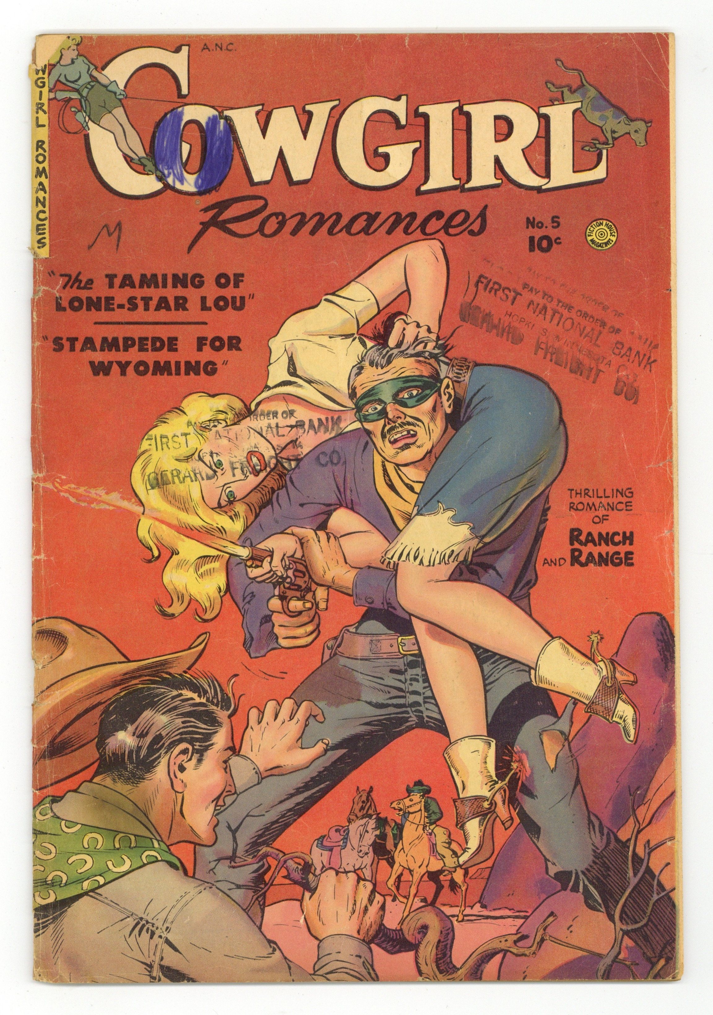 Art by Ken Battefield and others. Tender tales of romance among the cowhands and roughnecks of the Old West. As cowboy Gene prepares to marry redheaded cowgirl Kate, his vengeful ex-con ex-wife Louise shows up in town. Jane gets advice from her Native American godfather when cowhand Jim joins a group of outlaws. It turns out that the new schoolmarm in town is a crack shot. The cover promises "thrilling romance of ranch and range." The Taming of Lone-Star Lou; Fate Named Her Spitfire of the Prairies!; Stampede for Wyoming; Dead Man's Gold. 36 pages, Full Color. Cover price $0.10.