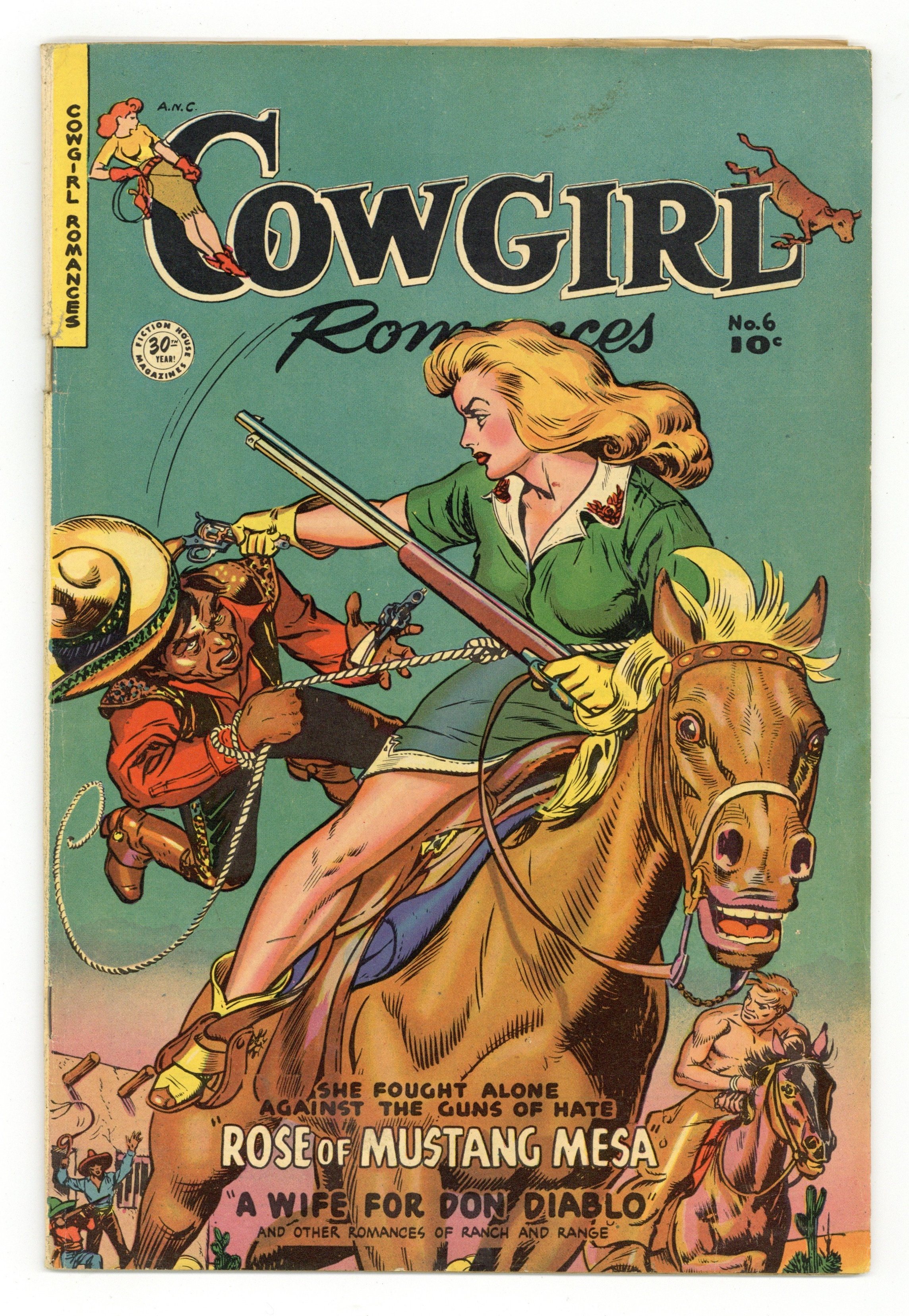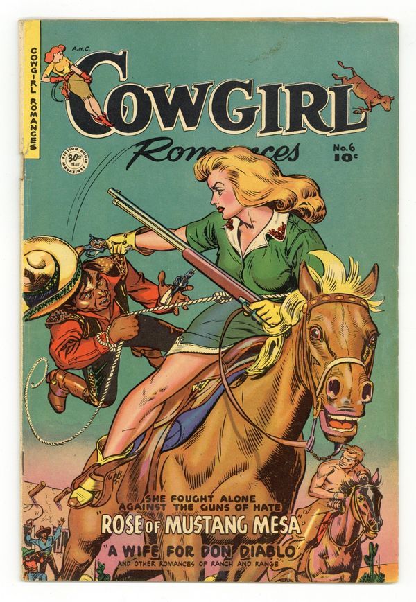 Tender tales of romance among the cowhands and roughnecks of the Old West. Tough but beautiful Rose Dawson, boss of the Bar B ranch, leads the charge against the Benson gang. Redheaded Martha swears revenge against the rustlers who killed her man Joe. Nan and her father are in trouble after her fiancee Jim gambles away the livestock. The cover promises "romances of ranch and range." Rose of Mustang Mesa; Romance Range; Wedding Bells and Bullets!; A Wife for Don Diablo. 32 pages, Full Color. Cover price $0.10.