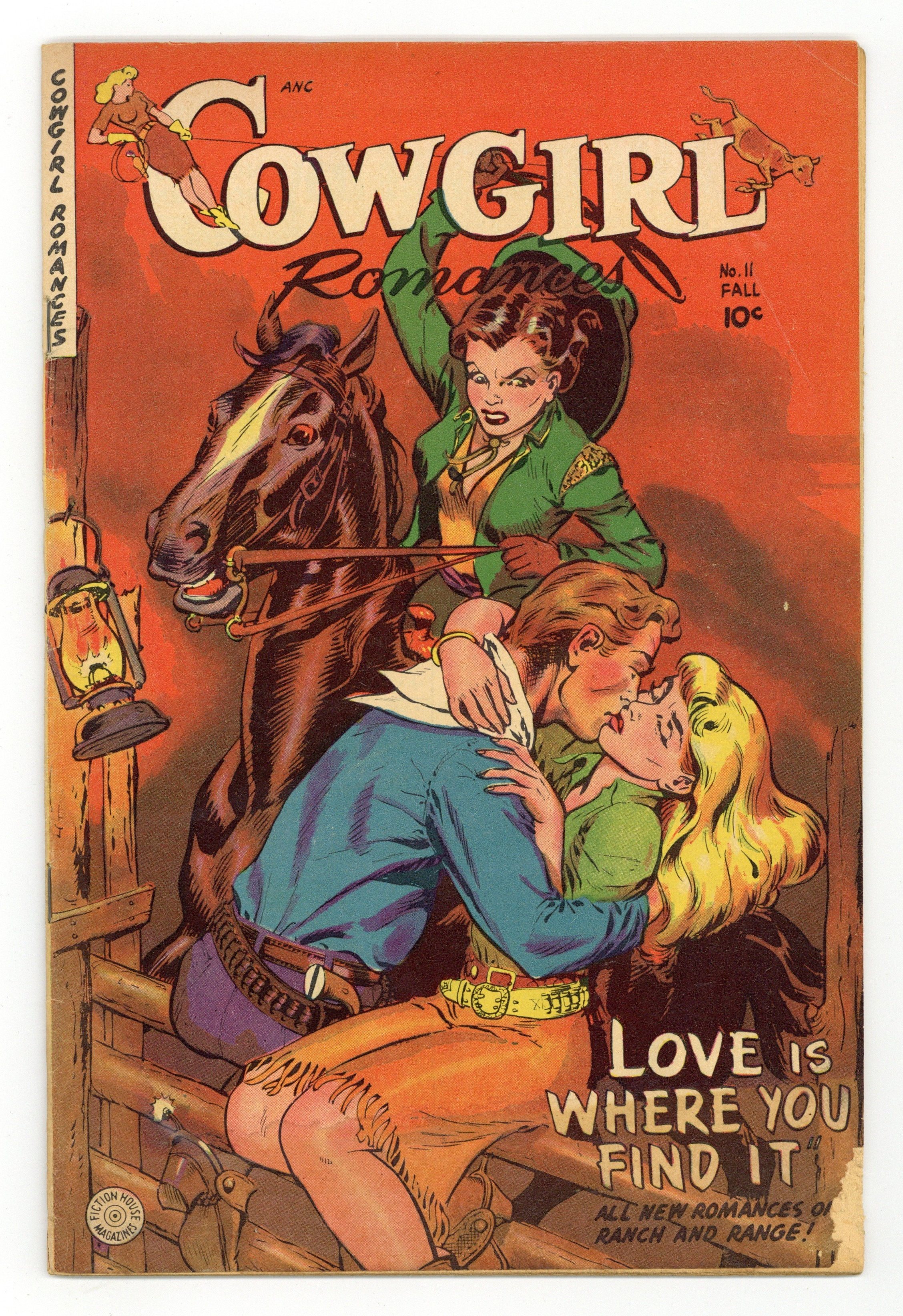 Art by Maurice Whitman, Pete Morisi and John Forte. Cover by Maurice Whitman. Tender tales of romance among the cowhands and roughnecks of the Old West. Ginny returns West to sell the family ranch and gets caught up with gold prospector Jim. Ellen is alarmed when handsome newspaperman Mark tells her that her boyfriend is rustling her cattle. Dance-hall girl Sally sacrifices her happiness to save her lover's life and get him back together with his high-class ex. The cover promises "all new romances of ranch and range." Also featuring a classic cover by Maurice Whitman. Love is Where You Find It; Fight for Your Love; The Terror of the Plains; Honeymoon Range; Heartbroken Buckaroo!; Ill Love You Always. 32 pages, Full Color. Cover price $0.10.