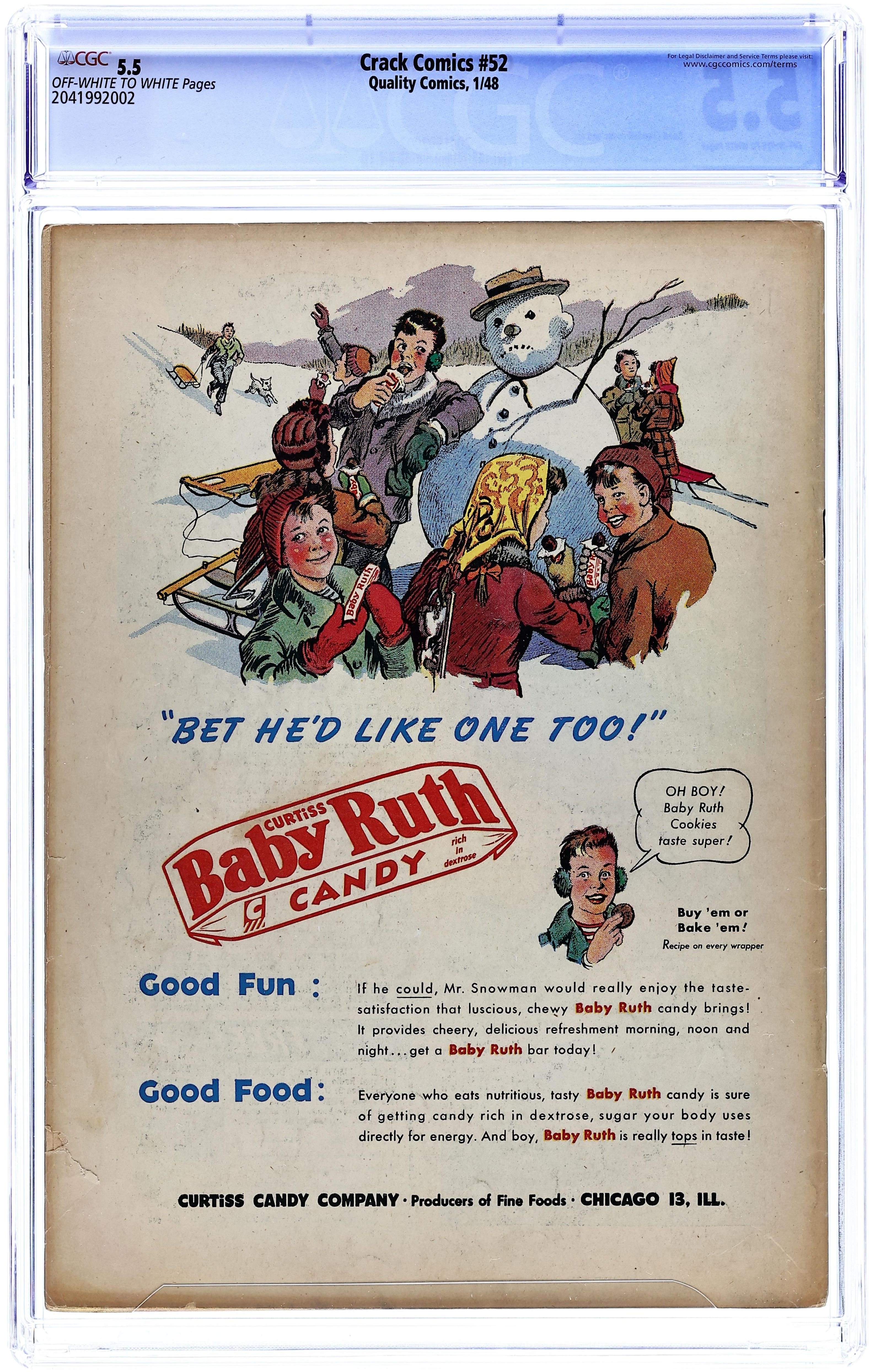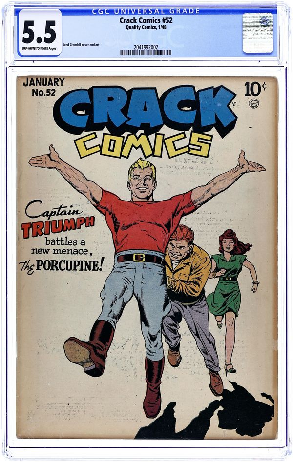Cover art by Reed Crandall. The Porcupine starring Captain Triumph, art by Reed Crandall; Fresh from their adventure with a werewolf, Lance and Kim enter a town and meet the Porcupine, who wore a coat of killer quills that he can throw with great accuracy, as well as using his body to topple walls by throwing himself into them. Mighty Midget starring Inkie, script and art by Al Stahl. Love and Larceny Don't Mix starring Hack O'Hara. The Pearl Swindle starring Pen Miller, script and art by Klaus Nordling. Floy Floy starring Floogy the Fiji. Fuzzy humor page by Jack Cole. Bubble Gum Cleopatra starring Beezy, script and art by Bernard Dibble. 52 pgs. $0.10. Cover price $0.10.