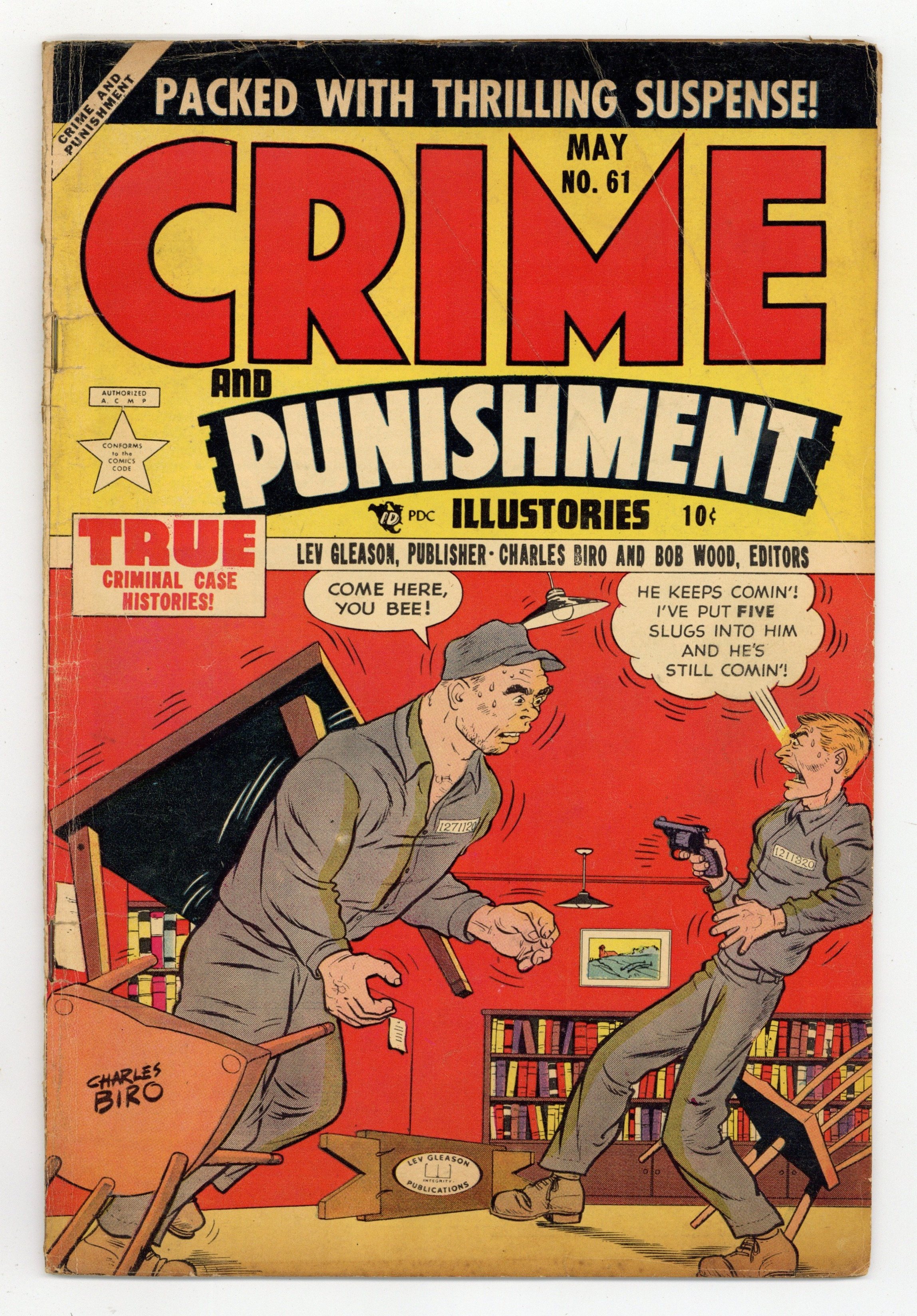 Published May 1953 by Lev Gleason.$21.00Cover by Charles Biro. Stories and art by Al Luster, Ken Landau, Al Wenzel, and Charles Biro. A companion series to Crime Does Not Pay from the same publisher, slightly less violent and with more emphasis on police work. A quartet of convicts prepares a prison break. In Morocco, two gamblers try to resolve their longstanding feud with knives and bullets. Star quarterback Teddy gets in over his head with gambling debts, so mobsters try to get him to throw a game. Also featuring Lev Gleason Comics Picture Trading Cards. The Big Crashout; Where Loser Takes All; Strange Criminals; Play Ball, or Play Dead. 32 pages, Full Color. Cover price $0.10.