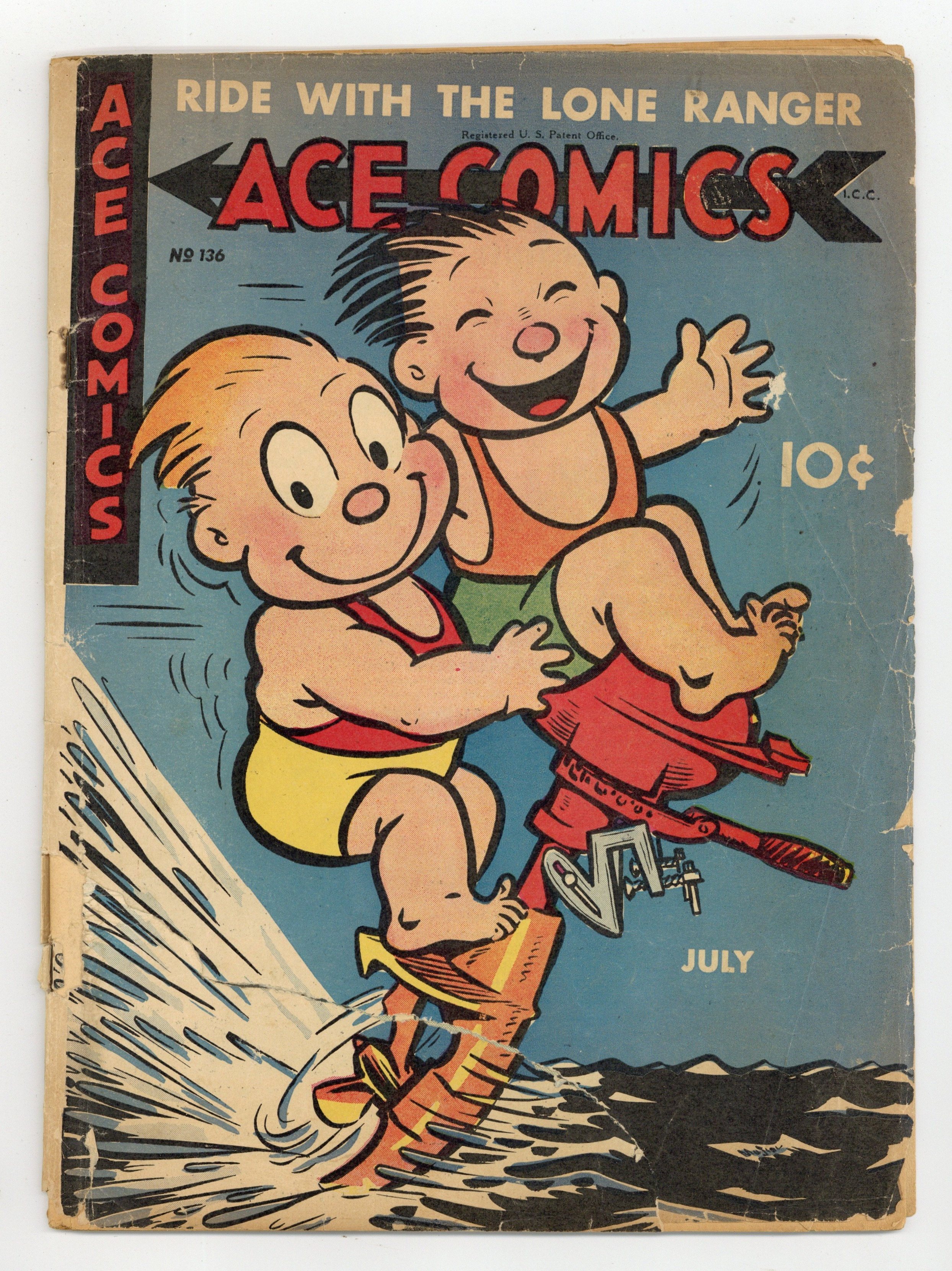 Cover by Joe Musial. Edited by Ruth Plumly Thompson (sometimes credited as Ace). Stories and art by Charles Flanders, Drake Williams, H. H. Knerr, Doc Winner, Chic Young, Joe Musial, Lee Falk, Ray Moore, William Ritt, Clarence Gray, Don Moore and Alex Raymond. Pioneering comics publisher David McKay presents an anthology series featuring reprints of King Features Syndicate comic strips. Includes Alex Raymond's Jungle Jim. The Phantom is arrested for The Crooner's crimes and cannot clear his own name; The Lone Ranger saves a Western town and rides off without even waiting for anyone to thank him. The Phantom; Jungle Jim; Henry; Katzenjammer Kids; Fighting Americans; Blondie; Brick Bradford; The Lone Ranger; Teddy and Sitting Bull; Doc Winner's Daffy Doodles. 32 pages, Full Color. Cover price $0.10.