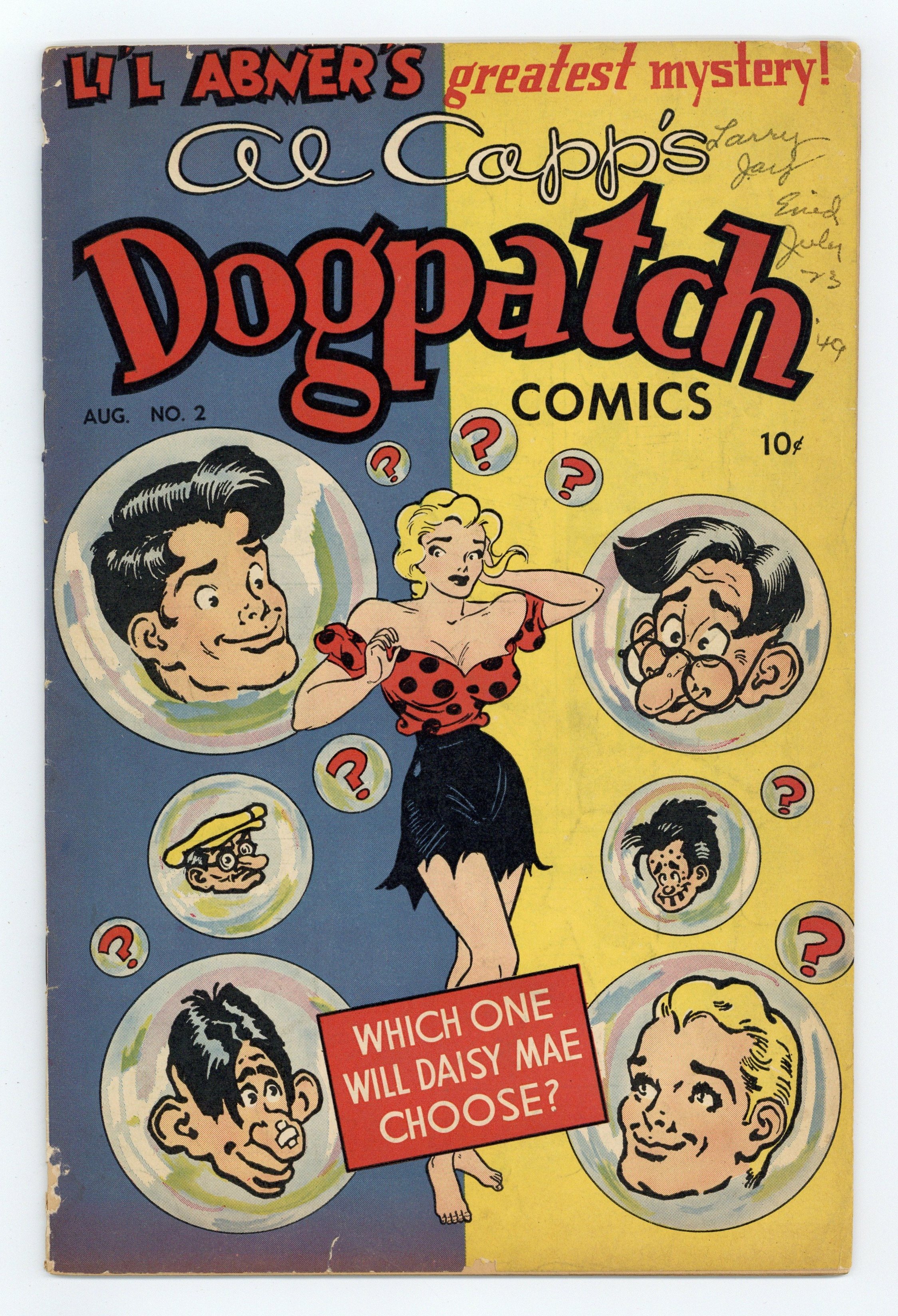 Cover by Al Capp. Stories and art by Al Capp, Vic Herman and Mell Lazarus. Reprints of the classic comic strip by Al Capp. Daisy Mae finds suitors lining up when her exact double arrives in Dogpatch. Nerdy boxer Kid Science tries to outthink Mug McSlugg while he's in training for their big bout. Two-Bit the Wacky Woodpecker, a bird who talks like WC Fields, destroys the clubhouse while looking for termites. Plus an early cartoon by Mell Lazarus, creator of the Momma and Miss Peach comic strips. Harlow Hedd, Private Eye; Daisy Mae's Double Trouble; Memphis Smith: Taxi; Kid Science; Two-Bit the Wacky Woodpecker. 32 pages, Full Color. Cover price $0.10.