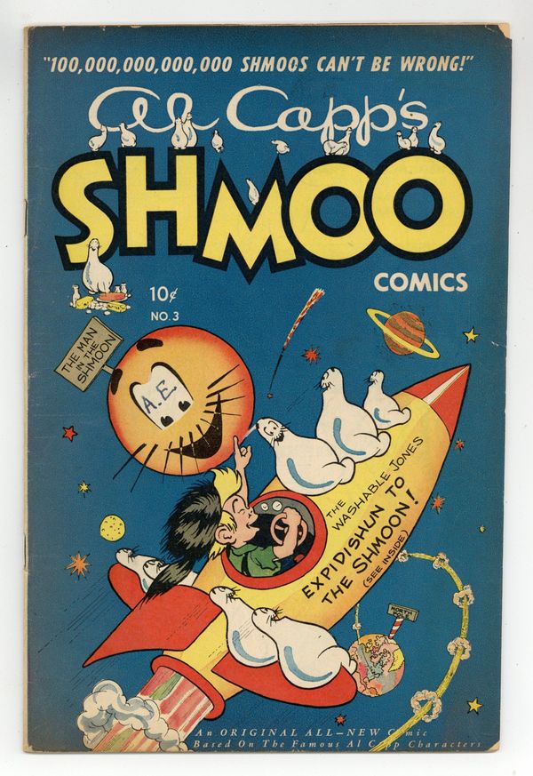 The strange little creatures from the classic Li'l Abner comic strip get their own comic book. Super Shmoo shmoos into action when a shipment of rare Shmooranium-235 goes missing. Meanwhile, Washable Jones and his friends the shmoos find themselves on the Moon. Super Shmoo: The Case of the Missing Shmooranium-235; Washable Jones and the Shmoos: Trip to the Moon; What Cheer; Two-Bit the Wacky Woodpecker; Stop the Shmoosic! 32 pages, Full Color. Cover price $0.10.
