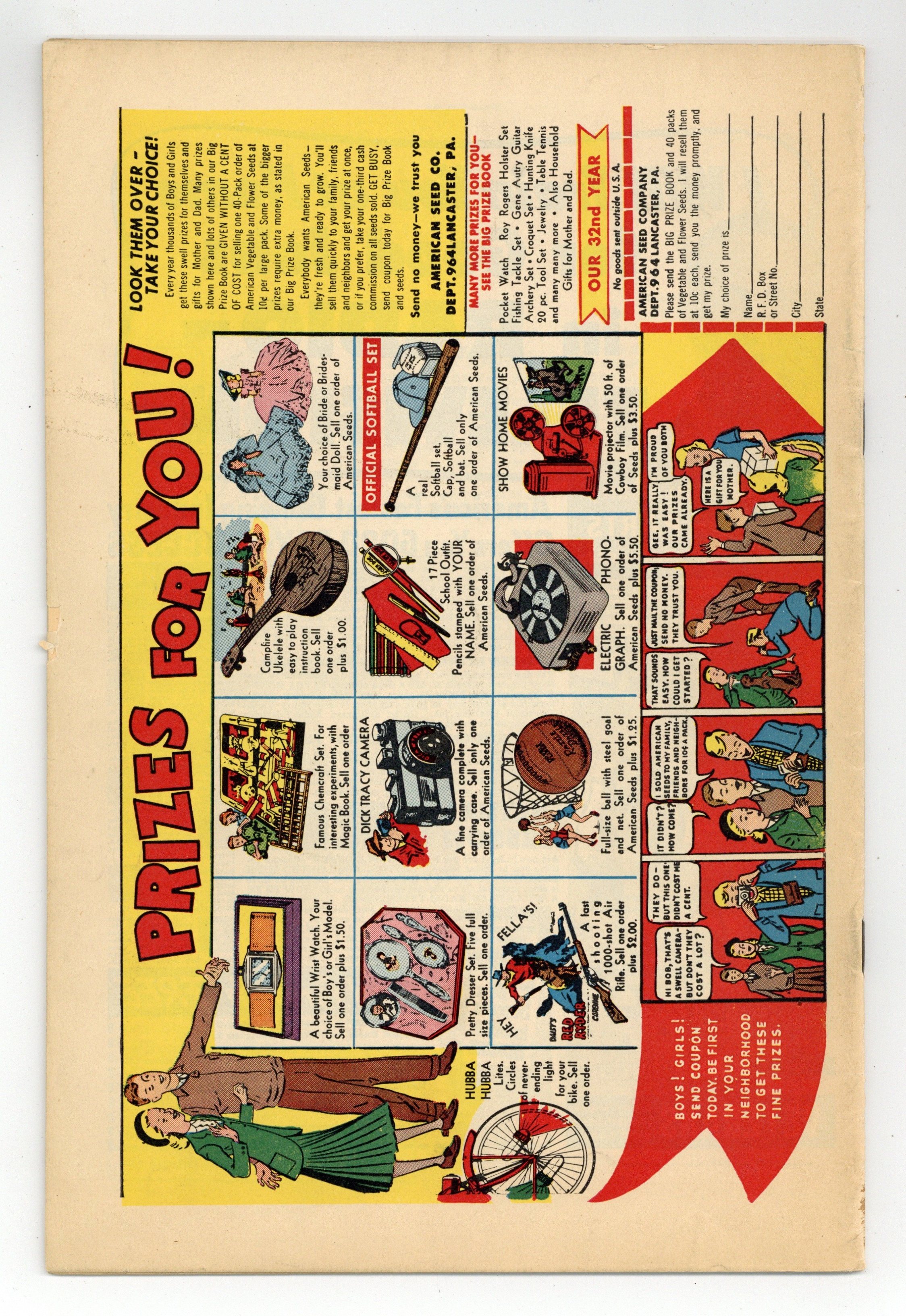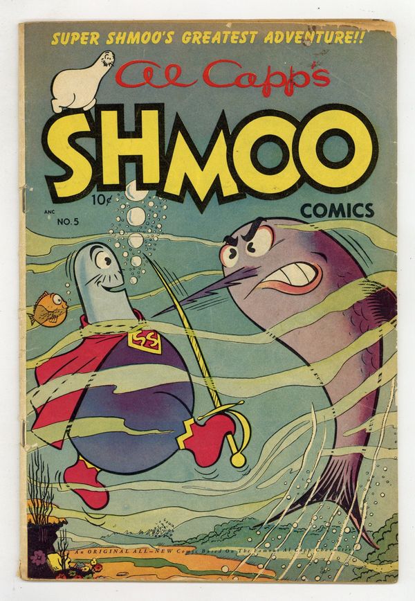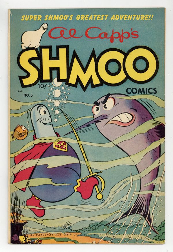 The strange little creatures from the classic Li'l Abner comic strip get their own comic book. In his civilian identity as Hugh Shmoo, Super Shmoo discovers the existence of microscopic Shmoos, otherwise known as Shmoo-Mee-Bas. Washable Jones and his friends the shmoos encounter the Sleeping Beauties and the Valley of the Golden Shmoos. Plus a vintage "Strengthen Liberty" PSA celebrating the 40th anniversary (1950) of the Boy Scouts of America. Super Shmoo: The Souse Sea Shmoo-Mee-Bas; Washable Jones: The Sleeping Beauties; Philo and Mr. OLearys Bird Whistle; Two-Bit the Wacky Woodpecker: Super Modern Cab; Washable Jones: The Valley of the Golden Shmoos; Leroy Lunkhead. Final issue of the series. 32 pages, Full Color. Cover price $0.10.