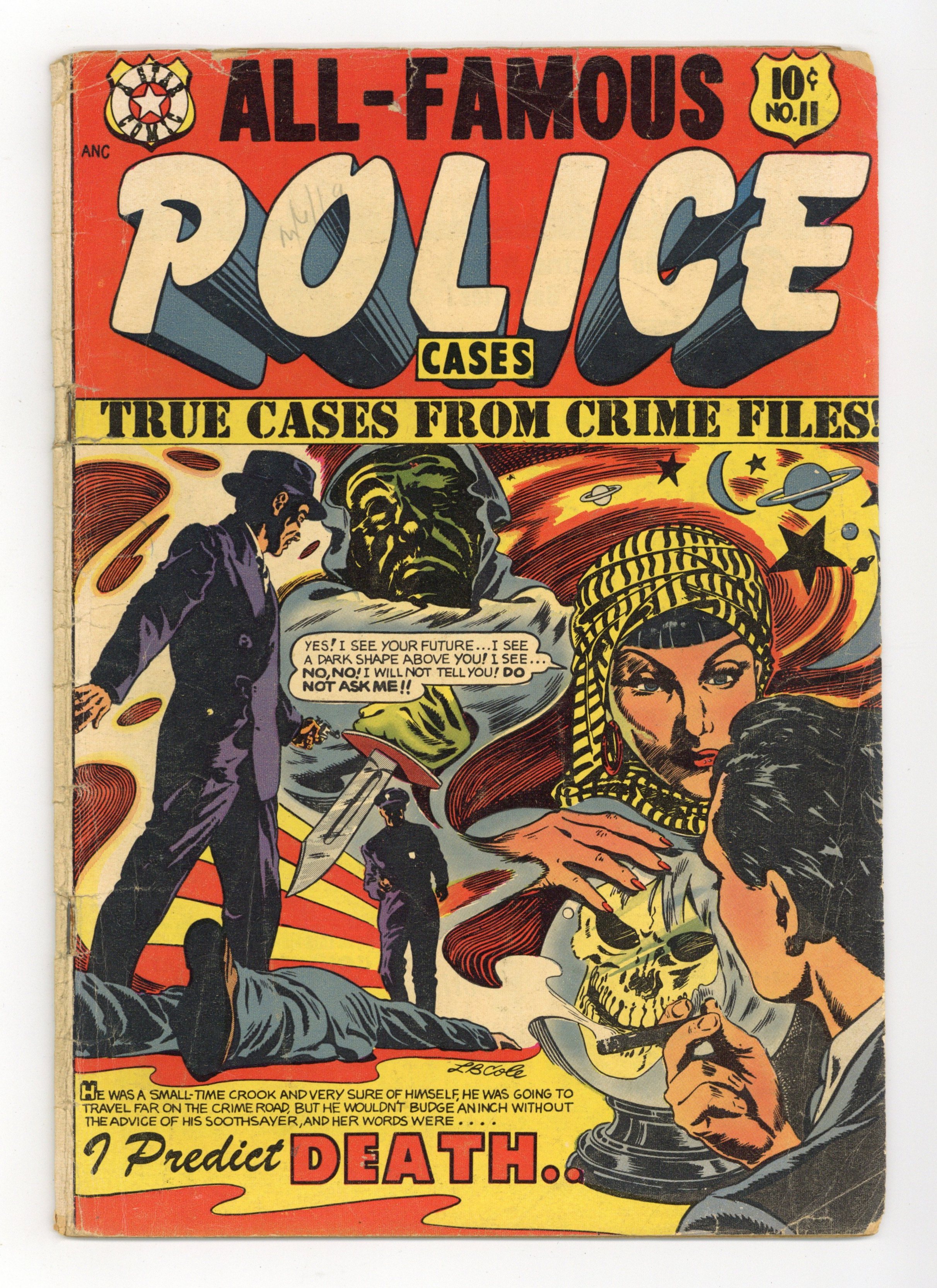 Cover by L. B. Cole. Pre-Code crime comics from L. B. Cole's Star Publications. Twins try to outdo each other in crime and murder. Poisoner Cordelia Botkin uses a deadly box of candy on her romantic rival, and accidentally sets a legal standard for the prosecution of interstate crimes. A superstitious hood consults a fortune teller to learn the path forward, but her predictions are dark indeed. The Twin Killers; The Poison Parcel; Murder for Money; I Predict Death. 32 pages, Full Color. Cover price $0.10.