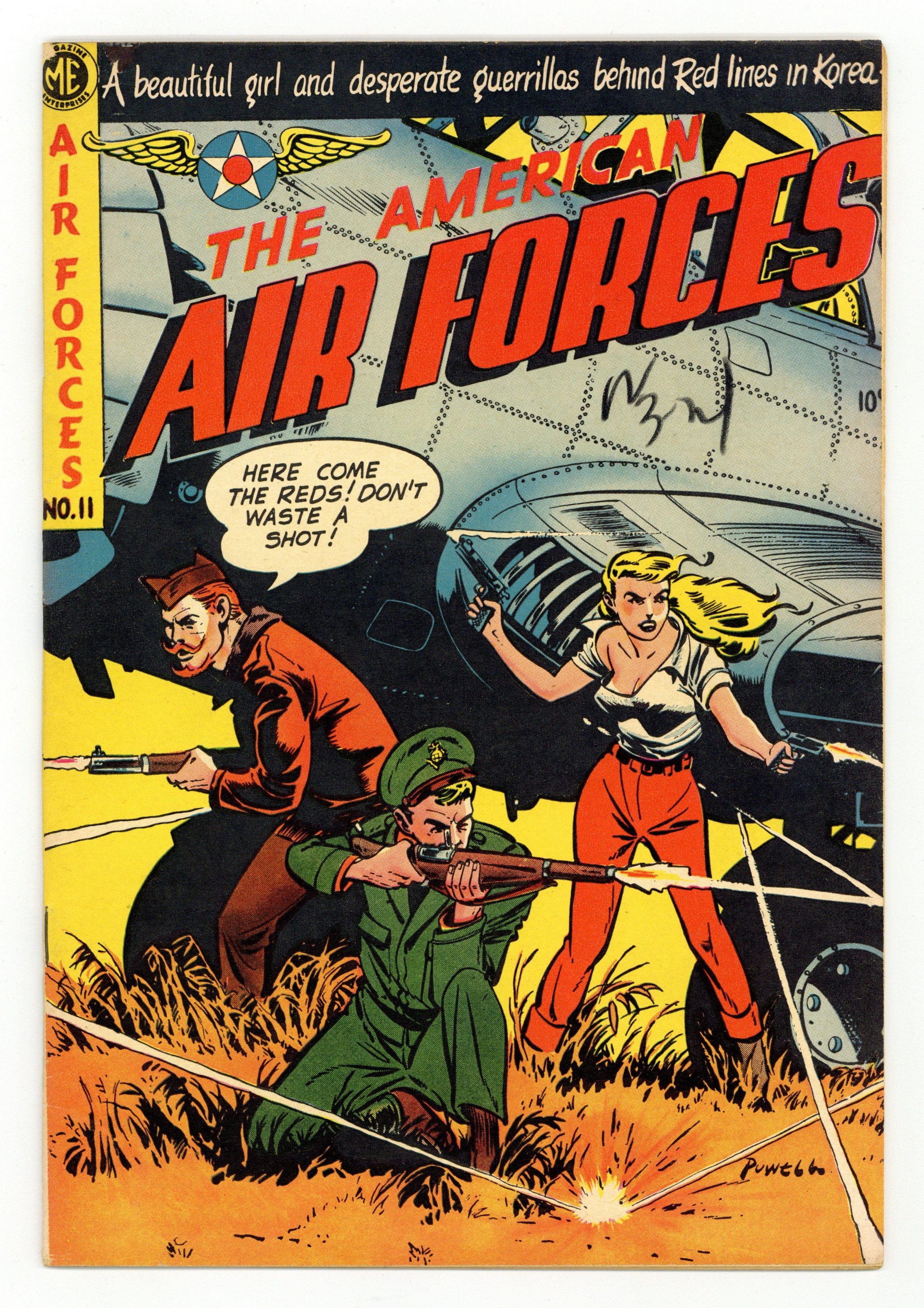 Cover by Bob Powell. Art by Bob Powell. Sometimes listed as A1 Comics (1944 Life's Romances) #79. Part of A1 Comics, an anthology from Magazine Enterprises with content that varied from month to month. This issue featured aviation adventure from the Korean War. The story of zeppelin attacks on London during World War I; A nonfiction piece about the history of flight covers the early years of lighter-than-air craft. Also featuring unusual ads for Hitler stamps left over from WWII Europe; Dean Martin and Jerry Lewis hand puppets; and live baby turtles (!). Action-packed Mike Battles cover by Bob Powell departs from the usual planes-in-flight approach. Mike Battles; Man Against the Sky!, Chapter 2; The Terror of the Big Cigars!; Rocky Beach; The Retread; Life Preserver. 36 pages, Full Color. Cover price $0.10.