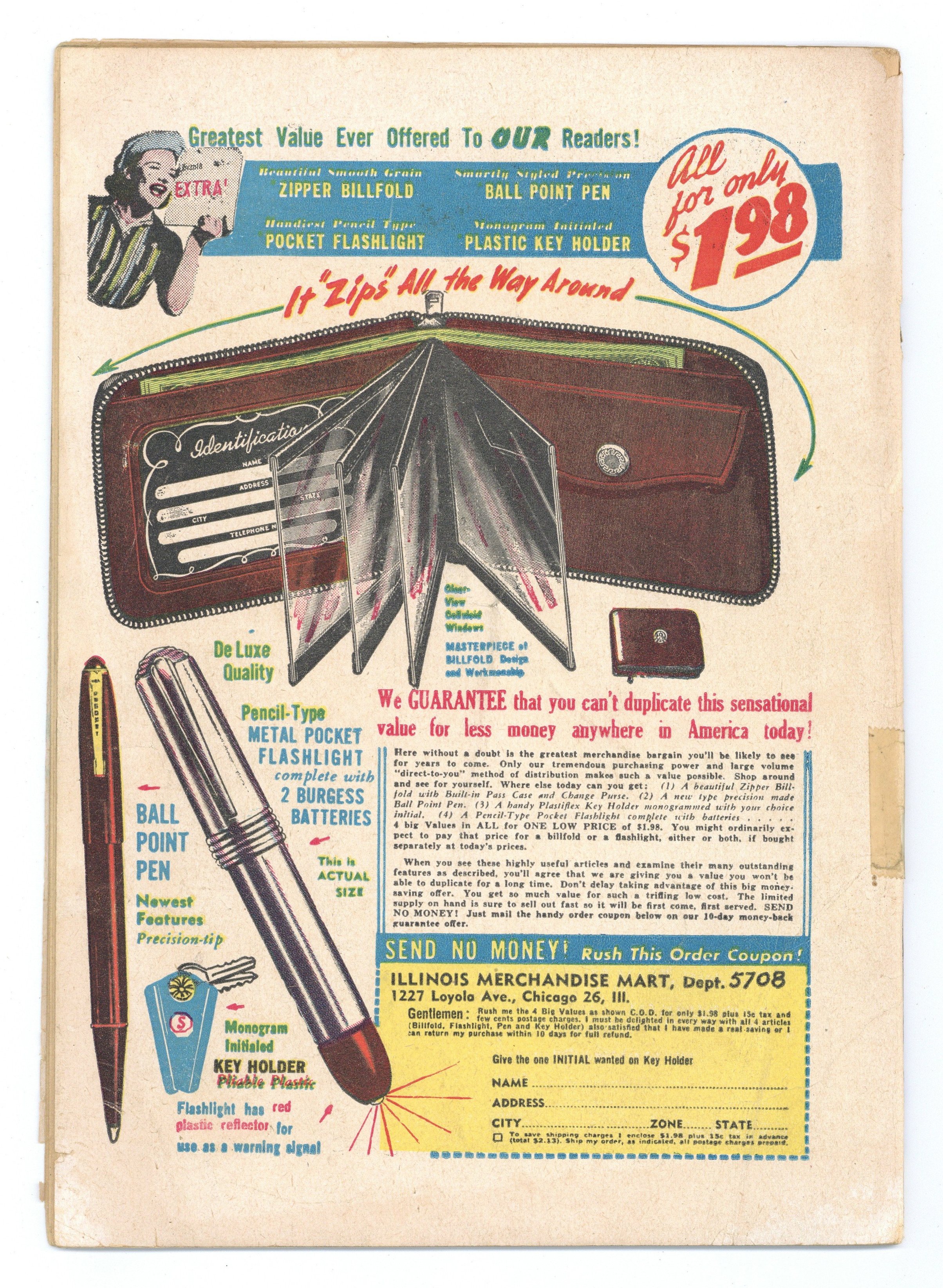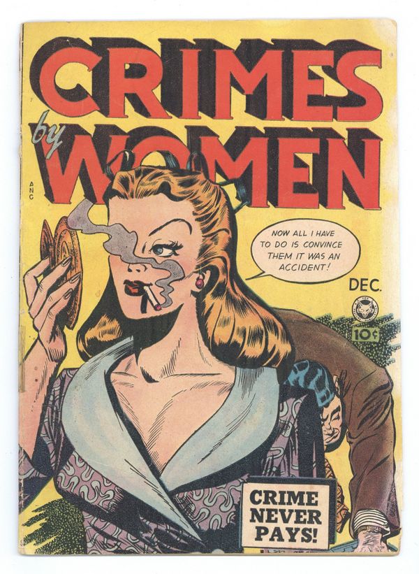 Art by Warren Broderick, T. Ward and Jimmy Maxwell. Fox Feature Syndicate creates a pre-Code title guaranteed to provide lurid covers and art, as women both historical and fictional commit murder and other heinous acts. Kitty Sarlo and her crony Sam hatch a scheme to get hapless soldiers drunk and then rob them; Foul-mouthed but beautiful Nellie turns to murder when a safecracking job goes wrong; Actress Connie Hale gets involved in a diamond-smuggling racket. Kitty Sarlo: The Female Leech; Nitro Nellie: The Savage Safe-Smashers; The Diamond of Kor-el-Maninoor; Man Trap. 32 pages, Full Color. All stories reprinted in Crimes by Women (1948) #54. In order of appearance: "Kitty Sarlo, The Female Leech"; "Nitro Nellie, The Savage Safe-Smashers"; and "Man Trap". "The Diamond of Kor-El-Maninoor" text story also reprinted in Zoo Funnies (1953 2nd Series Capitol/Charlton) #13. Cover price $0.10.