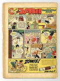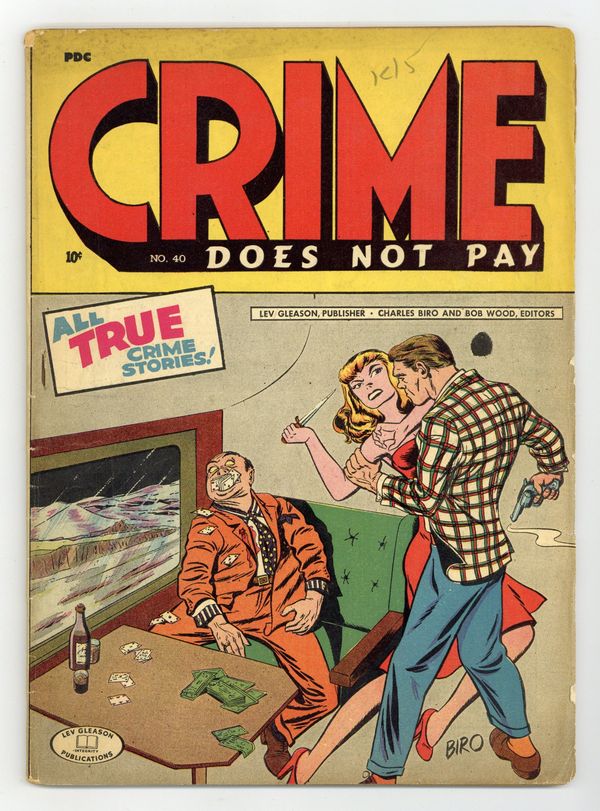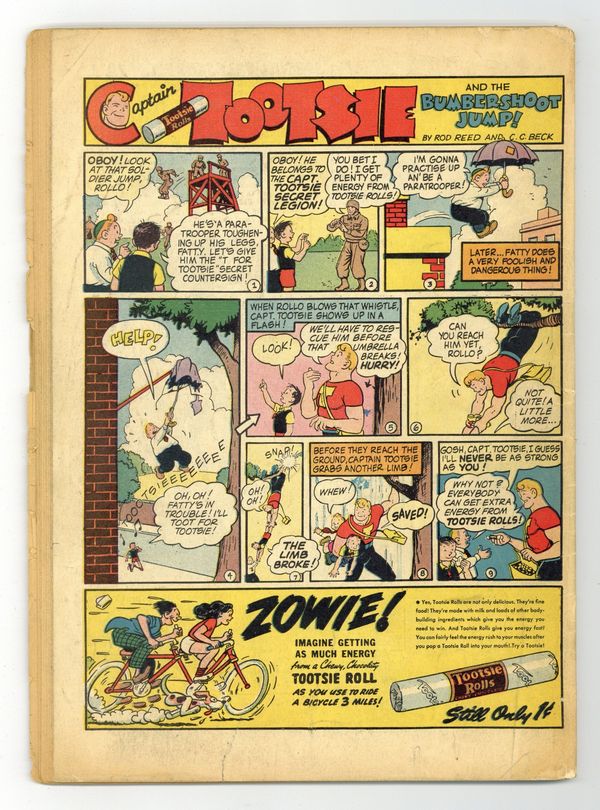 Cover by Charles Biro. Stories and art by C.C. Beck, Rod Reed, Rudy Palais, Dick Wood, Milt J. Kramer, Robert Sale and Charles Biro. The title that launched the crime comics genre, Crime Does Not Pay was noted for its violent pre-Code content and lurid tales of underworld life. The feud between New Jersey neighbors turns violent when they both become involved in illegal cockfighting, gambling and mobsters. Also featuring a vintage Tootsie Roll ad, "Captain Tootsie and the Bumbershoot Jump!," with art by C.C. Beck and Rod Reed. Plus a vintage PSA for the American war effort. An Important Message to the American People; Little Adam; The Feud of Happy McNulty and Fancy Campbell; The Last Laugh of the Lone Wolf Bandit; Alibi Murderer; Francesco the Terrible; This'll Kill You!; Whodunnit. 48 pages, Full Color. Cover price $0.10.