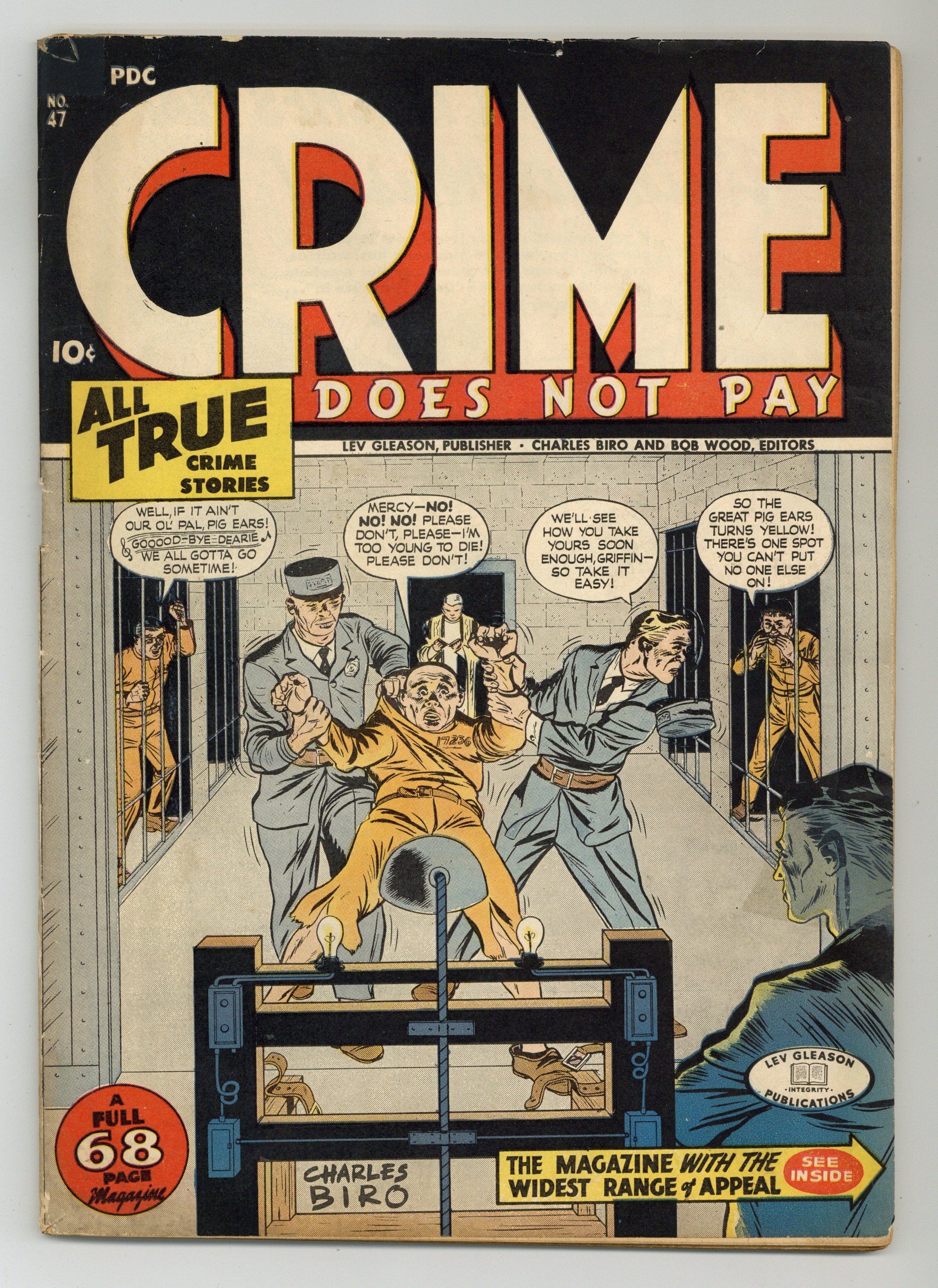 Cover by Charles Biro. Stories and art by Fred Guardineer, Mike Roy, Sam Burlockoff, Rudy Palais, George A. Marko, Arne Arntzen, Jack Alderman, Red Woodbury, Harley M. Griffiths and Charles Biro. The title that launched the crime comics genre, Crime Does Not Pay was noted for its violent pre-Code content and lurid tales of underworld life. The Schroeder gang robs and kills its way across 1920s America, led by bereted blonde Irene, featuring some classic bad-girl art by Fred Guardineer. Mr. Crime narrates the story of killers Steve and Tony, featuring a lurid image of an electric chair high atop the pile of their victims' bodies. The true story of violent criminal Vincent "Mad Dog" Coll. Also featuring a vintage ad for Pepsi starring Pepsi the Pepsi-Cola Cop, and a photo of the Lev Gleason creative staff: Bob Wood, Lev Gleason and Charles Biro. Thug's Throne; Fingers of Death; The Tri-State Terror; Mad Dog Vincent Coll; Triple Death and the Trail of Terror; The Terror Down Under; The Horrible Halzingers; Whodunnit. 68 pages, Full Color. Cover price $0.10.