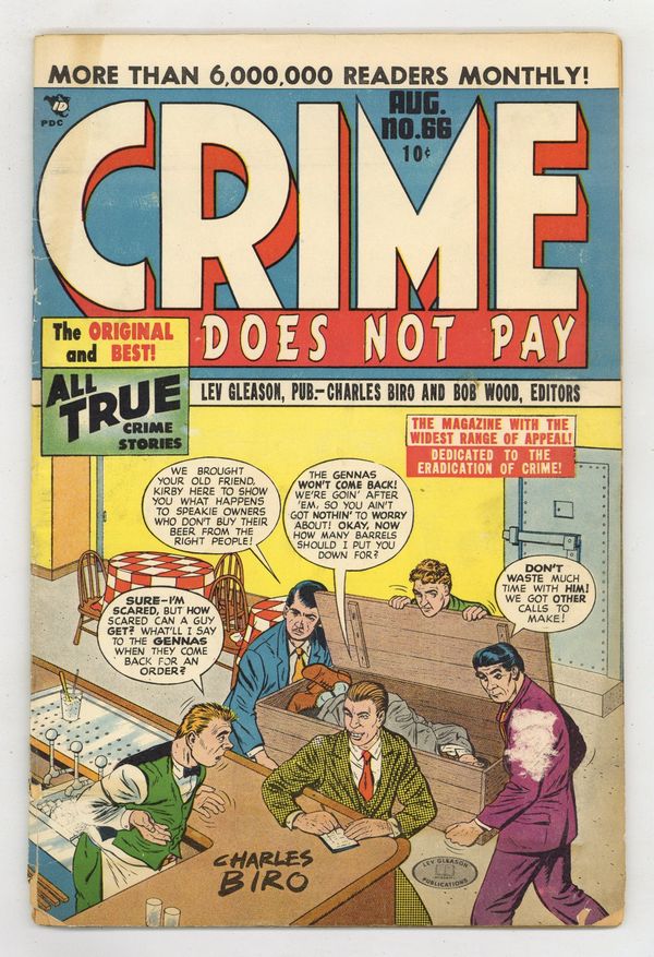 Cover by Charles Biro. Stories and art by George Tuska, Fred Guardineer, Claude Moore, and Charles Biro. The title that launched the crime comics genre, Crime Does Not Pay was noted for its violent pre-Code content and lurid tales of underworld life. Sicilian siblings the Genna Brothers rule Chicago's Little Italy, until they come up against Capone's Chicago Outfit. The history of the Brady Gang that terrorized Maine, and their bloody finish. An insane killer becomes known as the Nebraska Fiend and kills more than a dozen people in the 1870s. The Savage Genna Brothers: Bootleggers; On the Level; The Ferocious Brady Gang; Don't Die Laughing; Dick Richards, A Two-Legged Rat If There Ever Was One!; Crazy Dan Zarella and His Stupid Stooge, Vincent Furo; Who Dunnit? 52 pages, Full Color. Cover price $0.10.