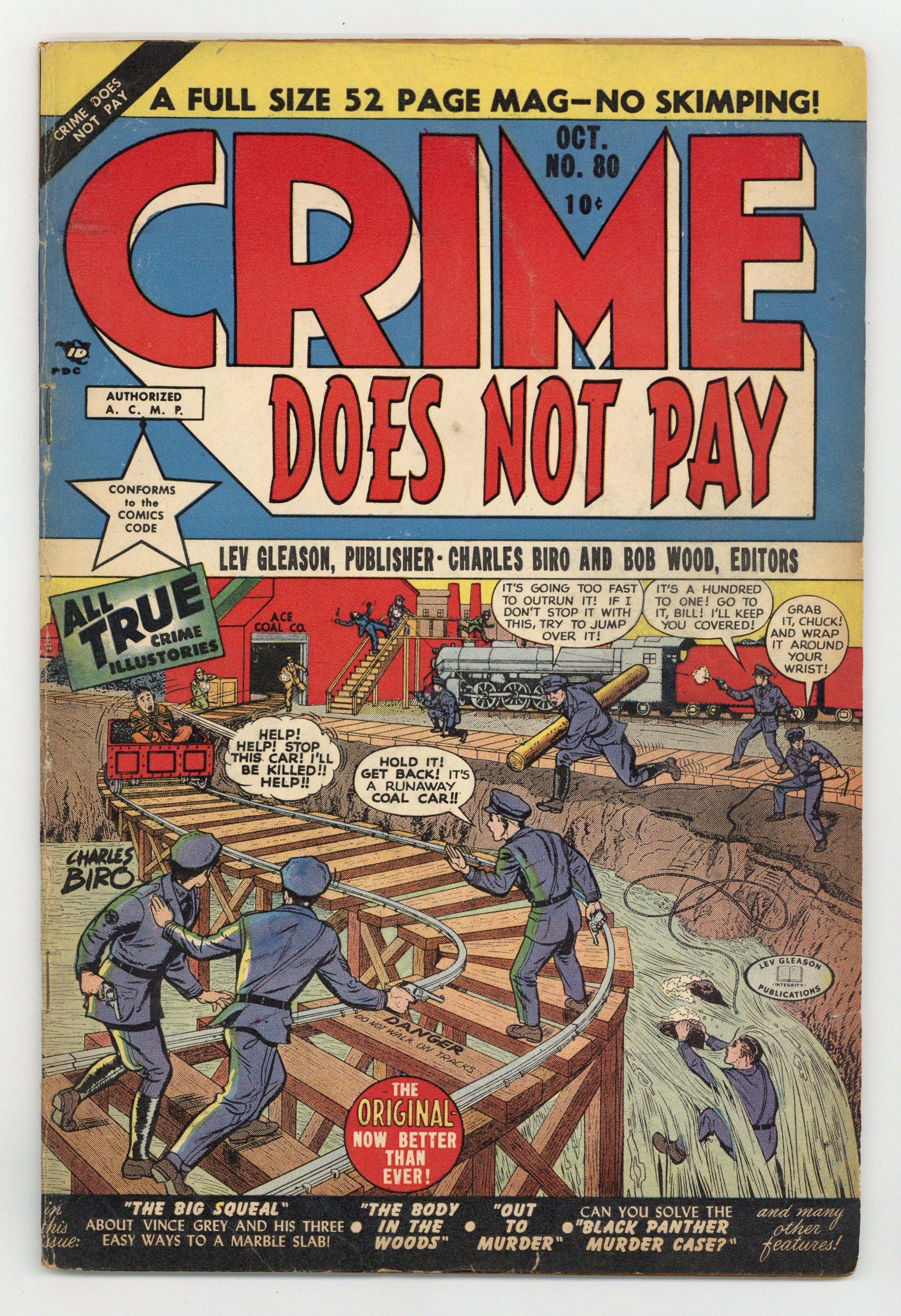 Cover by Charles Biro. Stories and art by George Tuska, Fred Guardineer, Claude Moore, Tony DiPreta, and Charles Biro. The title that launched the crime comics genre, Crime Does Not Pay was noted for its violent pre-Code content and lurid tales of underworld life. Mr. Crime narrates the tale of illegal arms trafficker Vince Grey, and his showdown with police at a coal refinery. A look at the uses of black light in crime detection and police work in the 1940s. A story that dares the reader to figure out who killed a big-game hunter on the eve of his wedding announcement. Cover and first page feature a photo endorsement from Mary Sullivan, NYPD Women's Bureau Chief, approving of "this magazine as a good moral influence on our youth." Vince Grey; This'll Kill Ya; Out To Murder!; On The Level; Our Police Hall of Fame; Science vs. the Criminal; The Body in the Woods; Who Dunnit. 48 pages, Full Color. Cover price $0.10.