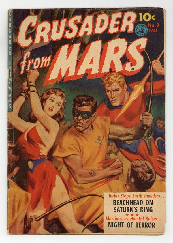 Martian criminals Tarka and Zira fight crime on Earth, as a form of cosmic community service. Commanded to battle evil, Tarka and Zira target a hate group called The Black Hoods. Then they confront the dictator of Uralia. A space cop goes undercover on the Prison Planet. Plus a look at the dangers of meteor strikes, and fun facts about Jupiter, Venus, and Jupiter's moons. Bondage cover by an unknown artist. Night of Terror; Beachhead on Saturn's Ring; Astronomical Oddities!; Meteors: Terrible Missiles from Space; Fun in the Future; Prison Planet; The Space Bums: Venus or Bust. Final issue of the series. 32 pages, Full Color. Cover price $0.10.