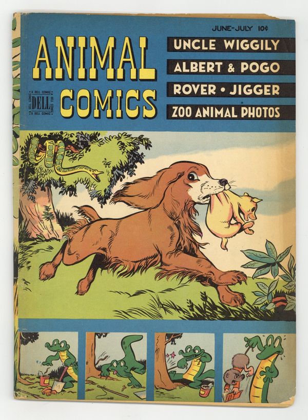 Cover by Walt Kelly and Dan Noonan. Stories and art by Walt Kelly, John Stanley, Hubbell R. McBride, Morris Gollub, Dan Noonan and Gaylord Du Bois (credited as Howard R. Garis). Dell's classic funny-animal series included early work by former Disney animator Walt Kelly, creator of beloved comic strip Pogo. In an early Pogo story by Kelly, Albert and Pogo try to play cricket. Red and Mike battle an evil priestess on Buena Vista Island. Jigger and Mooch try fishing, in a story by John Stanley of Little Lulu fame. Rover; Jigger; Albert and Pogo; Chuckwagon Charleys Tales; Nibs, a Little Deer of the Adirondacks; Uncle Wiggily. 48 Pages, Full Color. Cover price $0.10.