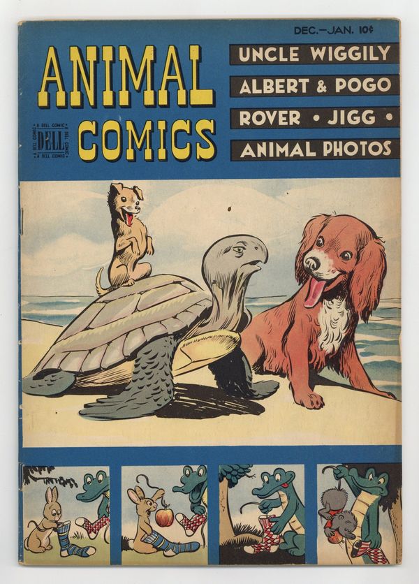 $32.00Cover by Walt Kelly and Dan Noonan. Stories and art by Walt Kelly, John Stanley, Hubbell R. McBride, Morris Gollub, Warren W. McSpadden, Harriet-Smith Hawley, Dan Noonan and Gaylord Du Bois (credited as Howard R. Garis). Dell's classic funny-animal series included early work by former Disney animator Walt Kelly, creator of beloved comic strip Pogo. In an early Pogo story by Kelly, Albert gets gigantic fish Heavy Joe to play along with his fish story. In another Kelly story, Nibble the mouse enlists the parrot to help him escape the house, but they're not ready for air travel. Jigger has to help Mooch escape after he's caught by the dogcatcher, in a story by John Stanley of Little Lulu fame. Rover; Jigg and Mooch; Albert and Pogo; Chuckwagon Charleys Tales; Putnams Cave; Nibble; Uncle Wiggily. Final issue of the series; Kelly continued Pogo's adventures in Pogo Possum (1949-1954 Dell) and the daily newspaper strip. 48 Pages, Full Color. Cover price $0.10.