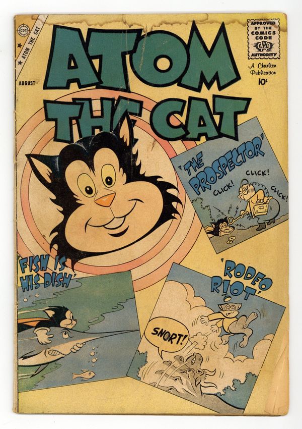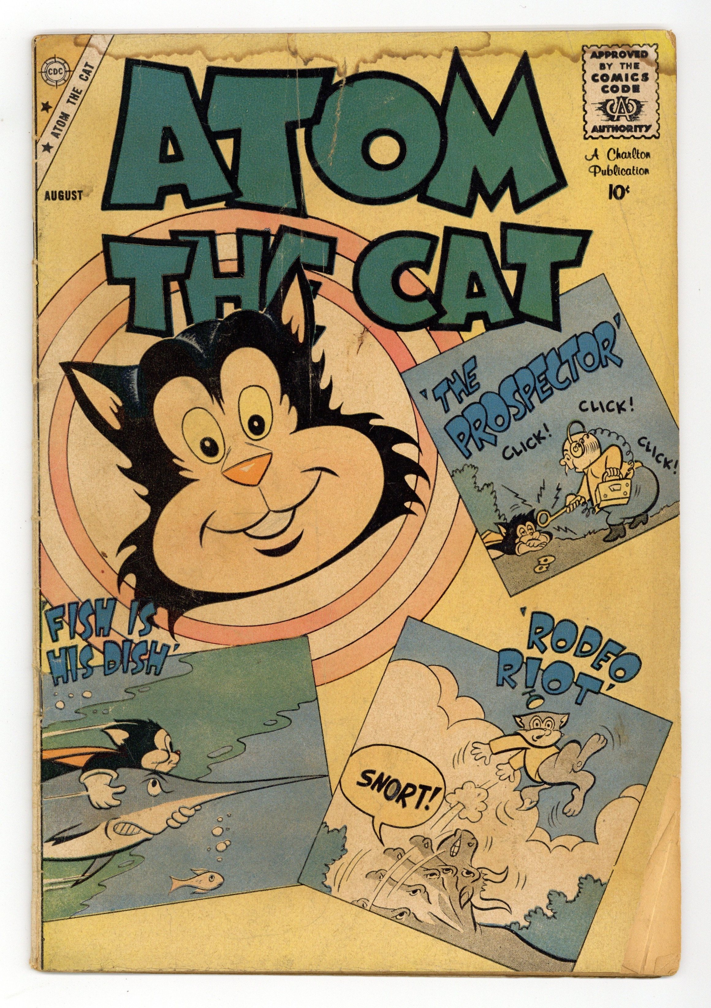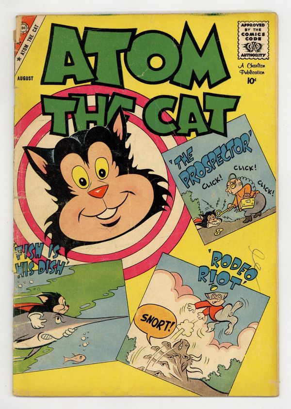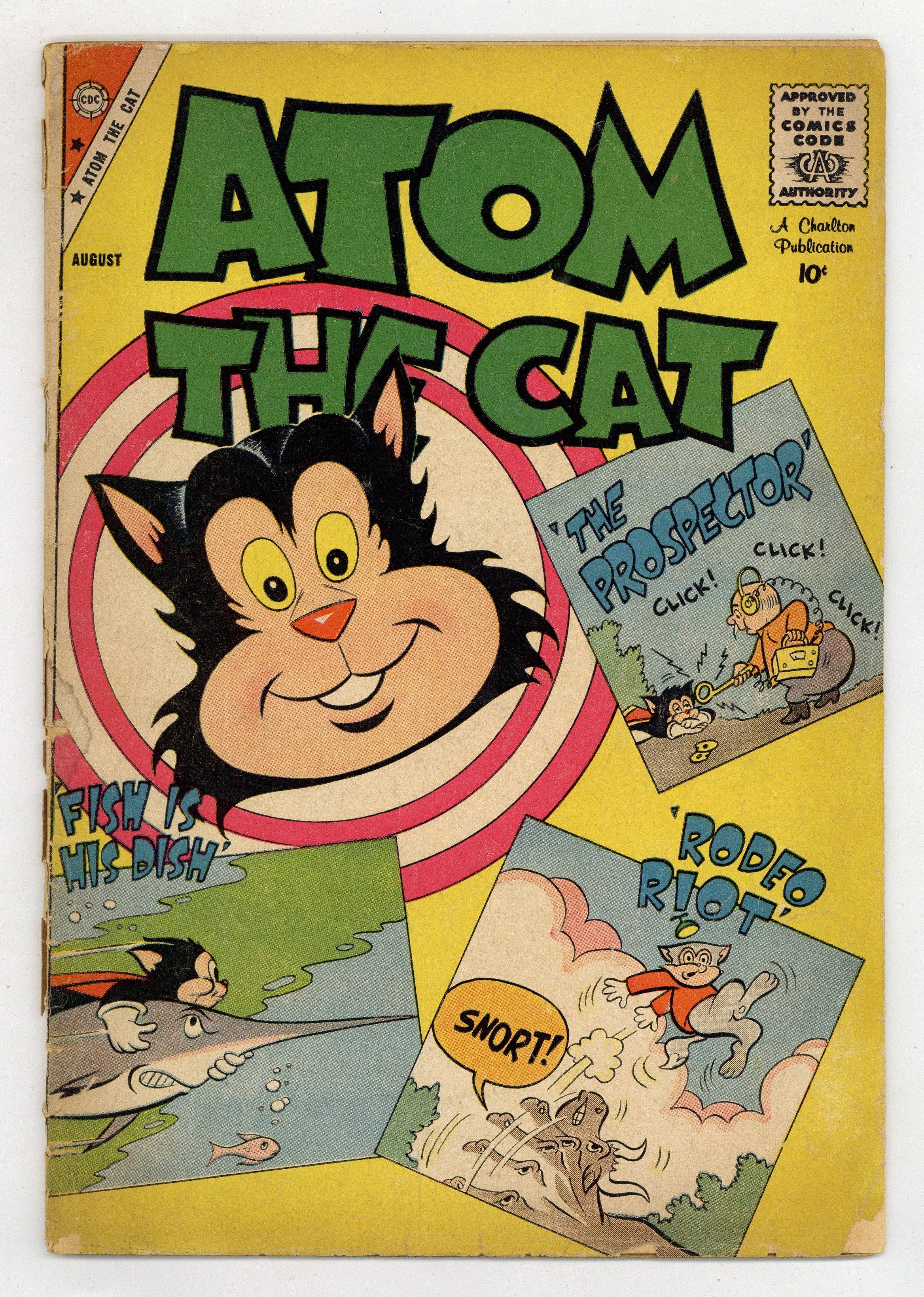 Stories and art by George Wildman and others. An ordinary cartoon cat is given superpowers by atomic rays and becomes a superhero. Atom offers to help Cuckoo Cat with rodeo events to impress Cuckoo's girlfriend. Atom uses his powers to improve his fishing. A uranium prospector wants to capture the atomic-powered Atom the Cat. Rodeo Riot; Fish Is His Dish; Lazy Chicken Bones; Why Do It the Hard Way?; A Dig in Time; Tillie Mouse: My Hero; Nut Hatched; The Prospector. Final issue of the series. 32 pages, Full Color. Cover price $0.10.