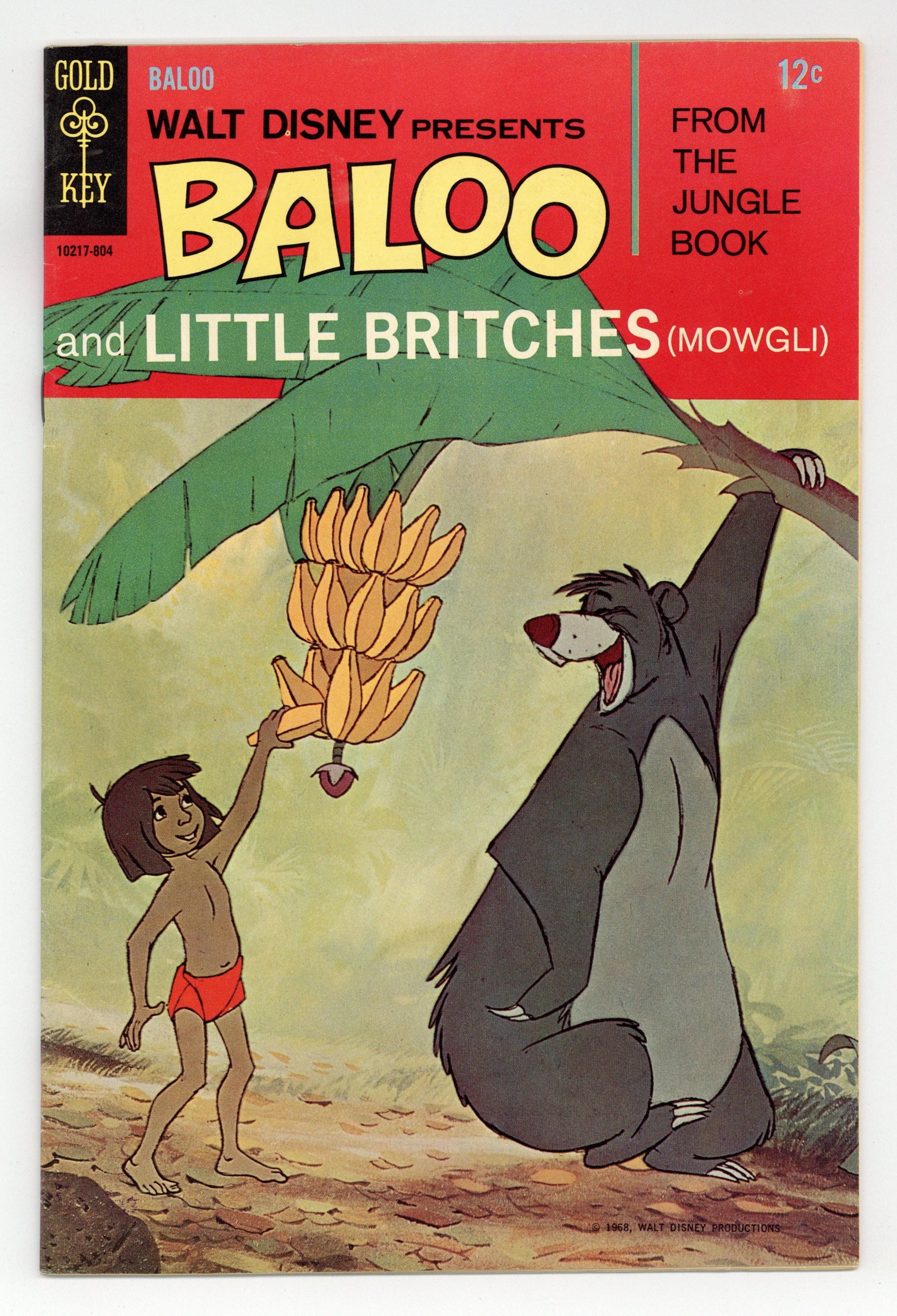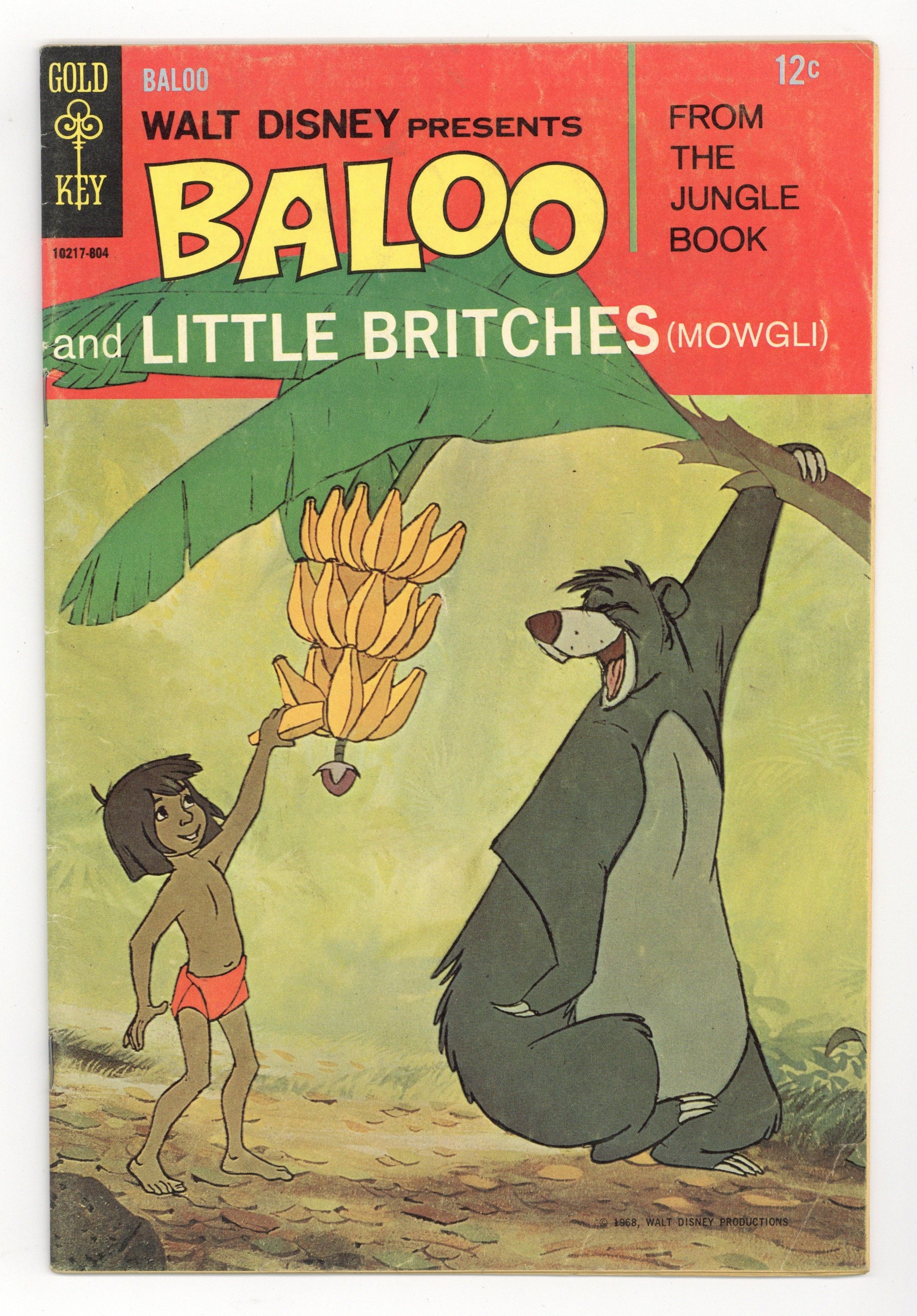$16.00From The Jungle Book. Walt Disney presents Baloo and Little Britches (Mowgli). Featuring: 16 page Baloo & Little Britches story "The Jungle Trap" drawn by Al Hubbard; 1 page filler "Keys of Knowledge, the Kinkajou" (panel art with text); 1 page Picture Dictionary filler "Scale" (panel art with text); 2 page Jest For Fun filler "Riddles & Jokes"; 1 page Dinosauria filler "Styracosaurus" (panel art with text); 10 page Baloo & Little Britches story "Guardian Angel" drawn by Al Hubbard; 1 page Mini-Comics story (gag sequences). Cover price $0.12.