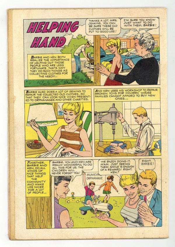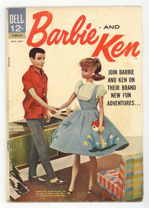 Art by Vince Colletta and John Tartaglione. Cover number is #12-053-307. Dell creates the first comic book based on the popular Barbie and Ken dolls. Members of the Barbie Fan Club discuss their imaginary adventures with Barbie and Ken. Jody sees baton-twirling Barbie leading the town parade before the big game. Switchboard operator Barbie shows Cindy how 1960s-era telephone-exchange technology works, including pre-911 emergency calls. Mitzi visits the circus with her Uncle Ben, and Barbie is the star of the show. Plus one-pagers about Ken and Barbie, including their charity work. Miss Wonderful; Barbie's Baton; Emergency; Sun and Fun; Helping Hand. 32 pages, Full Color. Cover price $0.12.