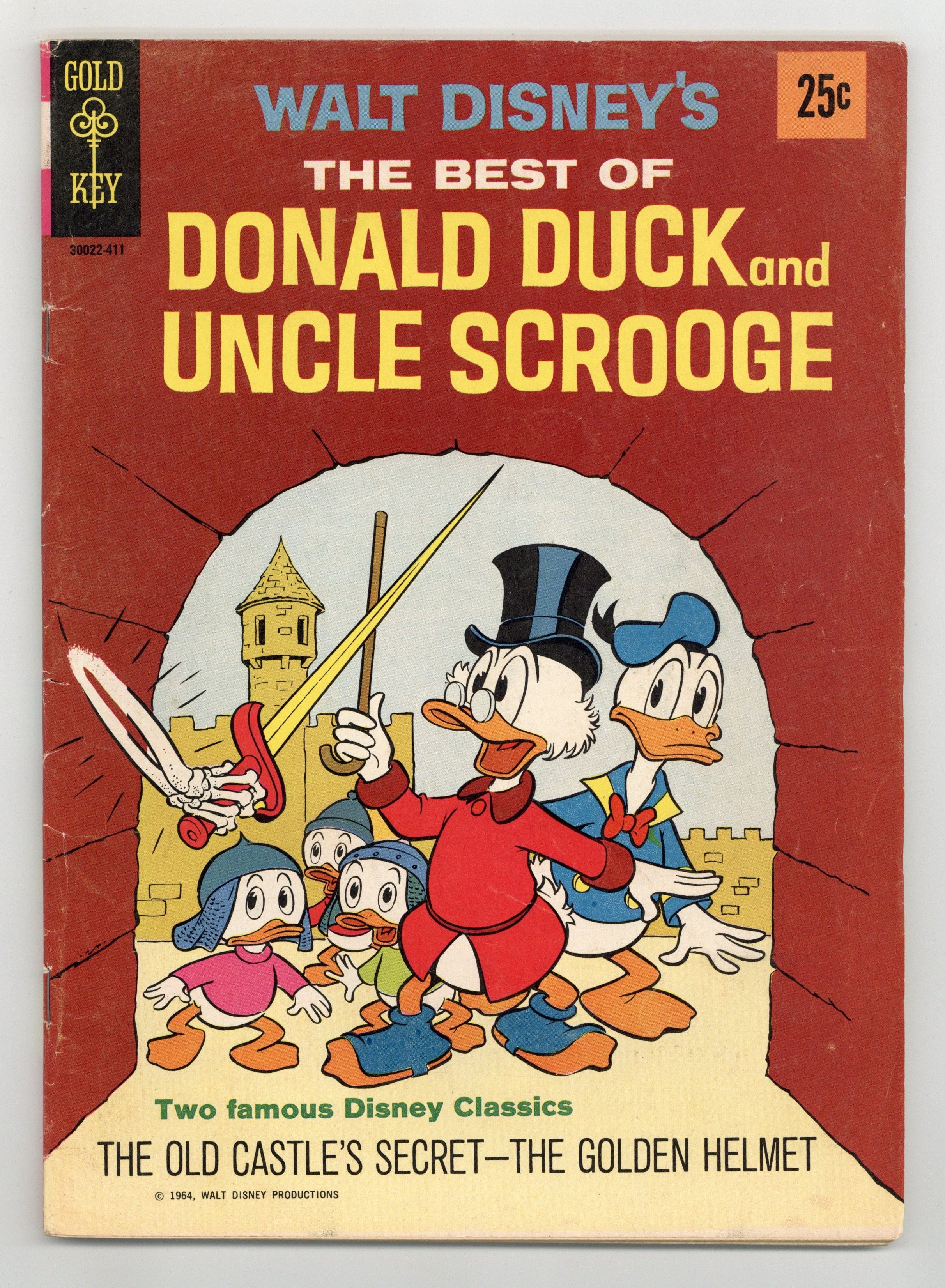 THE BEST OF DONALD DUCK AND UNCLE SCROOGE (GOLD KEY) #1 1964 25c Giant size comic reprinting two classic Duck stories by Carl Barks: "The Old Castle's Secret" in which Donald, Scrooge, Huey, Dewey, and Louie search for an ancient treasure in the ancestral home of clan McDuck, an old castle in Scotland and "The Golden Helmet" in which Donald and Huey, Dewey, and Louie journey far away to find the legendary golden helmet, the bearer of which will own North America. One page gag-strips on inside covers. Front cover features the "The Old Castle's Secret" and the back cover features "The Golden Helmet." Cover price $0.25.
