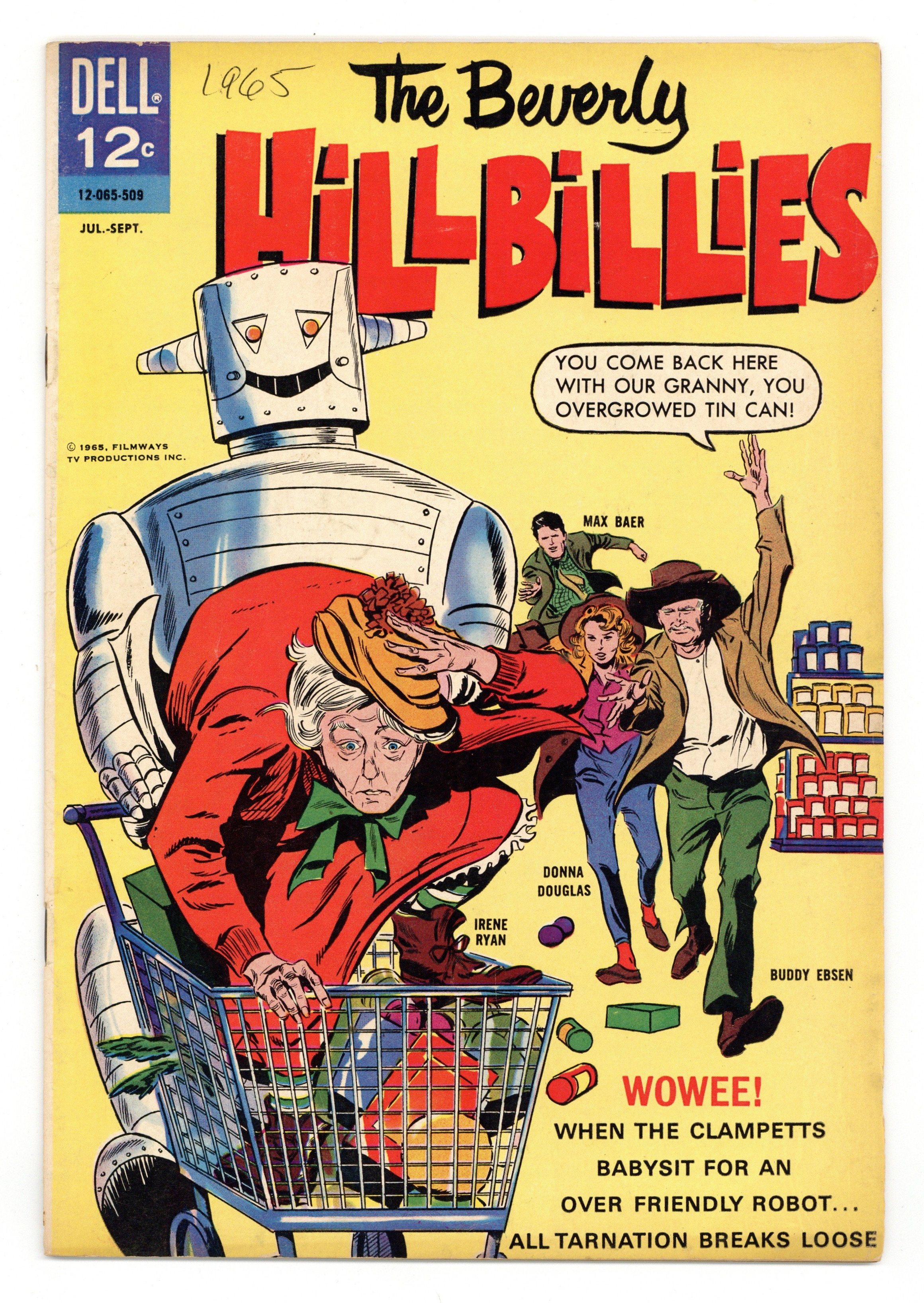 Cover photo of Donna Douglas, Irene Ryan, Buddy Ebsen, and Max Baer. Stories by D.J. Arneson. Art by Henry Scarpelli. Cover number is #12-065-509. Based on one of the most popular TV shows of all time; the countrified Clampetts move to upscale L.A. after striking it rich. In a three-part, issue-length story, Professor Dyno asks the Clampetts to watch his robot, Rufus. But things get out of hand when Granny takes Rufus shopping, and he falls in love with a washing machine. Farm Boy's sow saves a rodeo cowboy from a bull. My Son, the Monster; The Rufus Rumpus; Raising the Rufus; The New Friend; Farm Boy: How Now, Brown Sow. 32 pages, Full Color. Cover price $0.12.