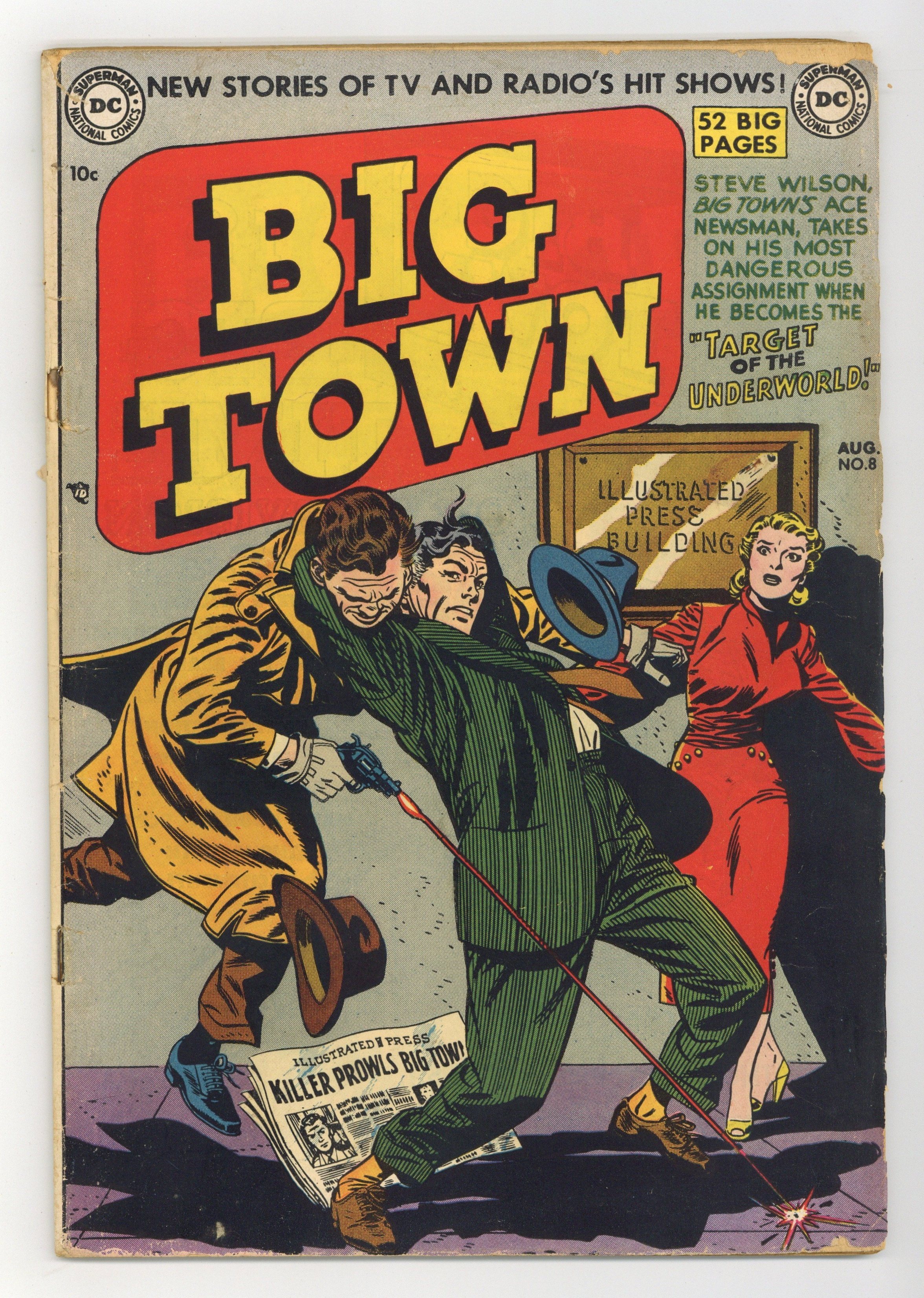 Based on the TV and radio show of the same name, Big Town lasted 50 issues. This installment includes the following: "The Man Who Died Yesterday!" (Steve Wilson investigates a killer's double); "The Target of the Underworld!"; "The Network of Crime" (with Johnny Law); and "The Case of the Stolen Face!" Scripts by Dave Wood and Miriam Hecht, pencils by John Lehti and Irwin Hasen, inks by Frank Giacoia and Joe Giella. Cover by Alex Toth and Sy Barry. Cover price $0.10.