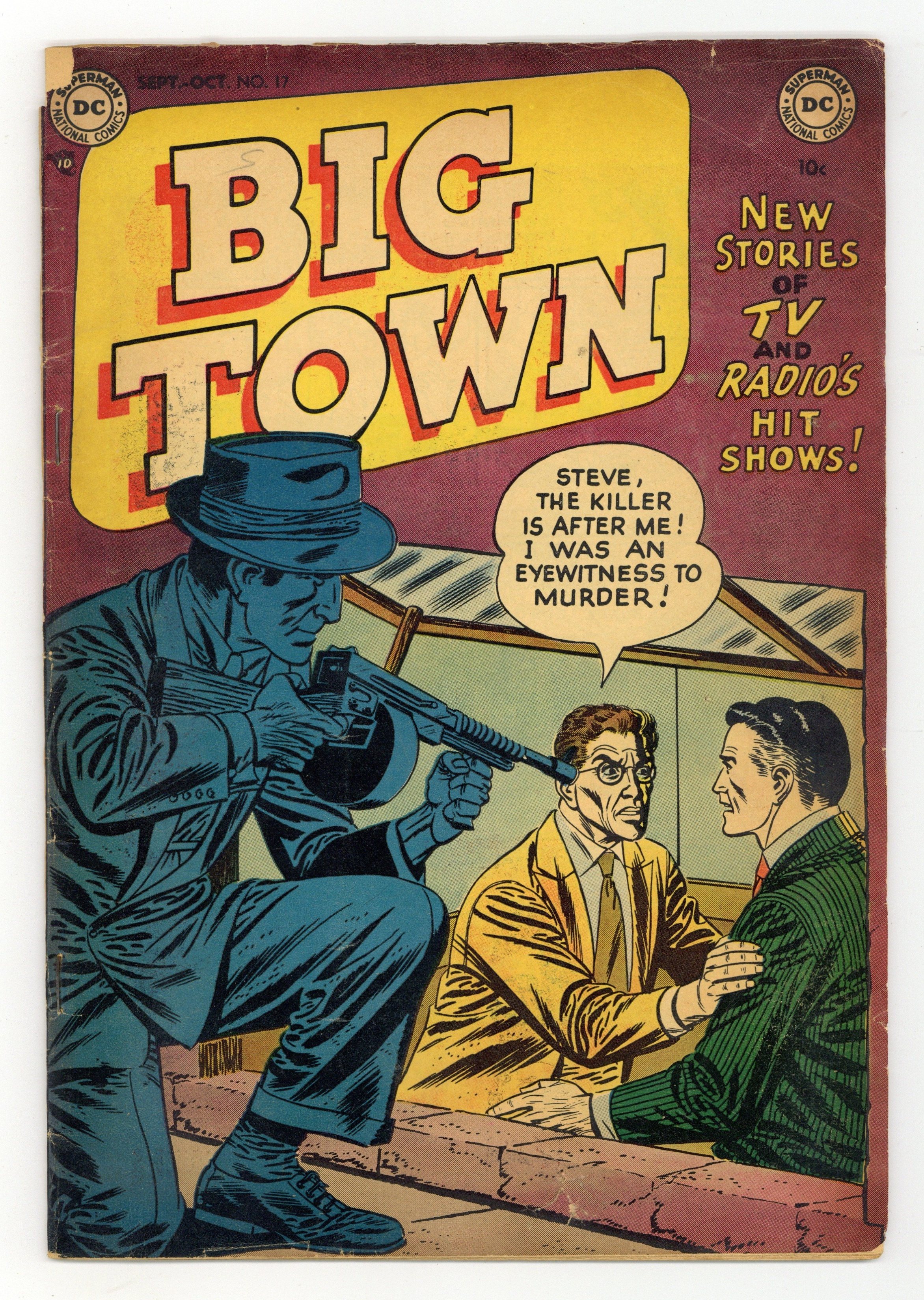 Based on the TV and radio show of the same name, Big Town lasted 50 issues. This installment includes the following: "Reporter for a Day!" (A rewrite man for The Illustrated Press accompanies Steve Wilson on a dangerous assignment); "The Perfect Crime Club!"; "I Was an Eyewitness to Murder!"; and "Clay Pigeon!" (with Johnny Law). Scripts John Broome and Dave Wood, pencils by Manny Stallman and Frank Giacoia, inks by John Giunta and Bob Lander. Cover by Gil Kane and Joe Giella. Cover price $0.10.