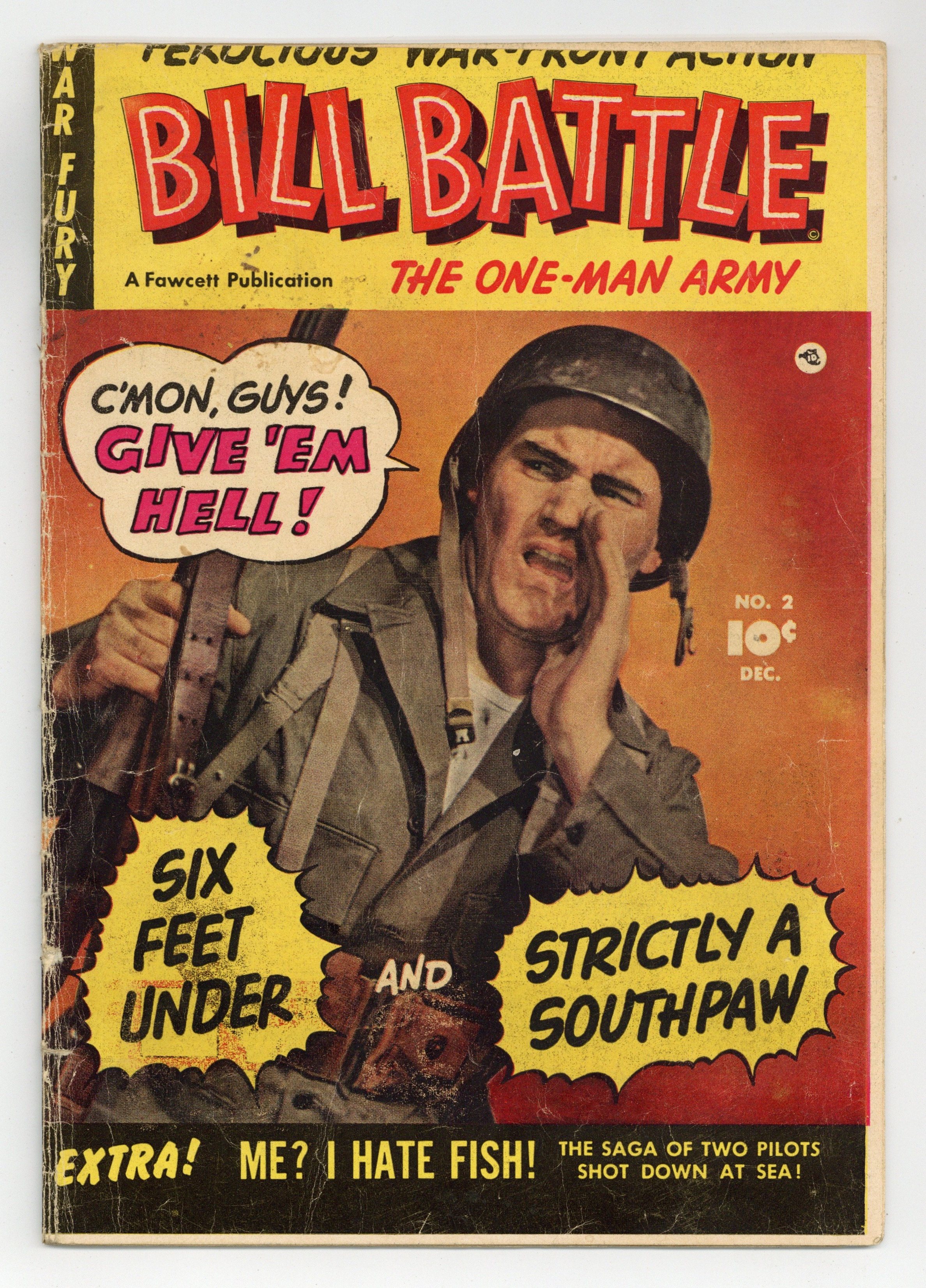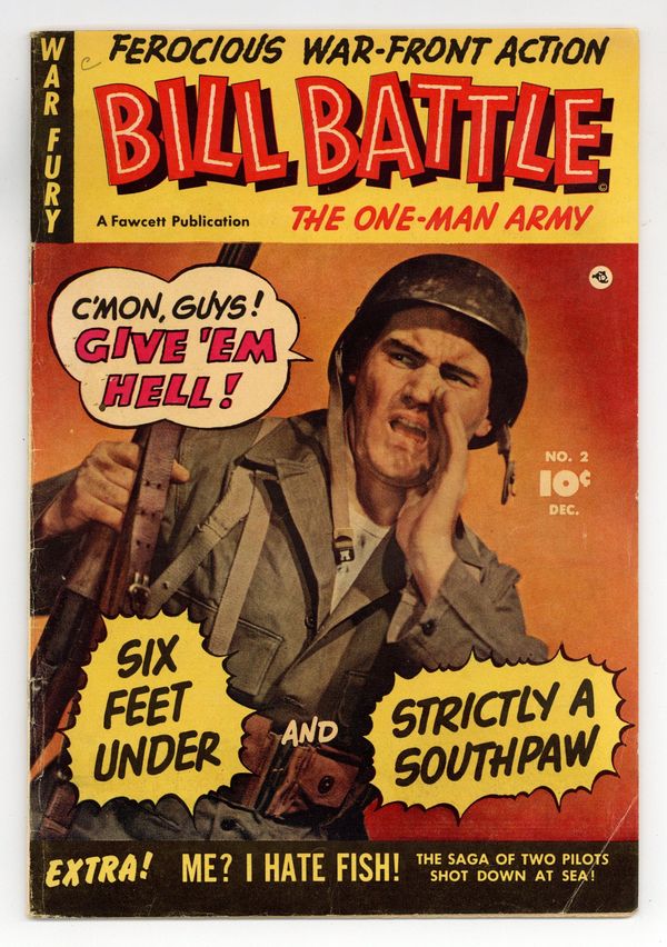 Stories and art by John Martin and Clem Weisbecker. The Korea-set Bill Battle comics leaven the usual grim war stories with whimsical dark battlefield humor. Bill tries to find out how the enemy is getting tanks across the river, when the bridge has already been blown up. Two airmen struggle to survive in a raft after their bomber is shot down over open ocean. After Bill Battle is wounded by a stray shell, he refuses to cooperate with medics, telling them, "You're holdin' up my war!" Six Feet Under!; And Then the Bugle Blew!; Barrage; Eyes Right!; Strictly a Southpaw; Me? I Hate Fish! 32 pages, Full Color. Cover price $0.10.
