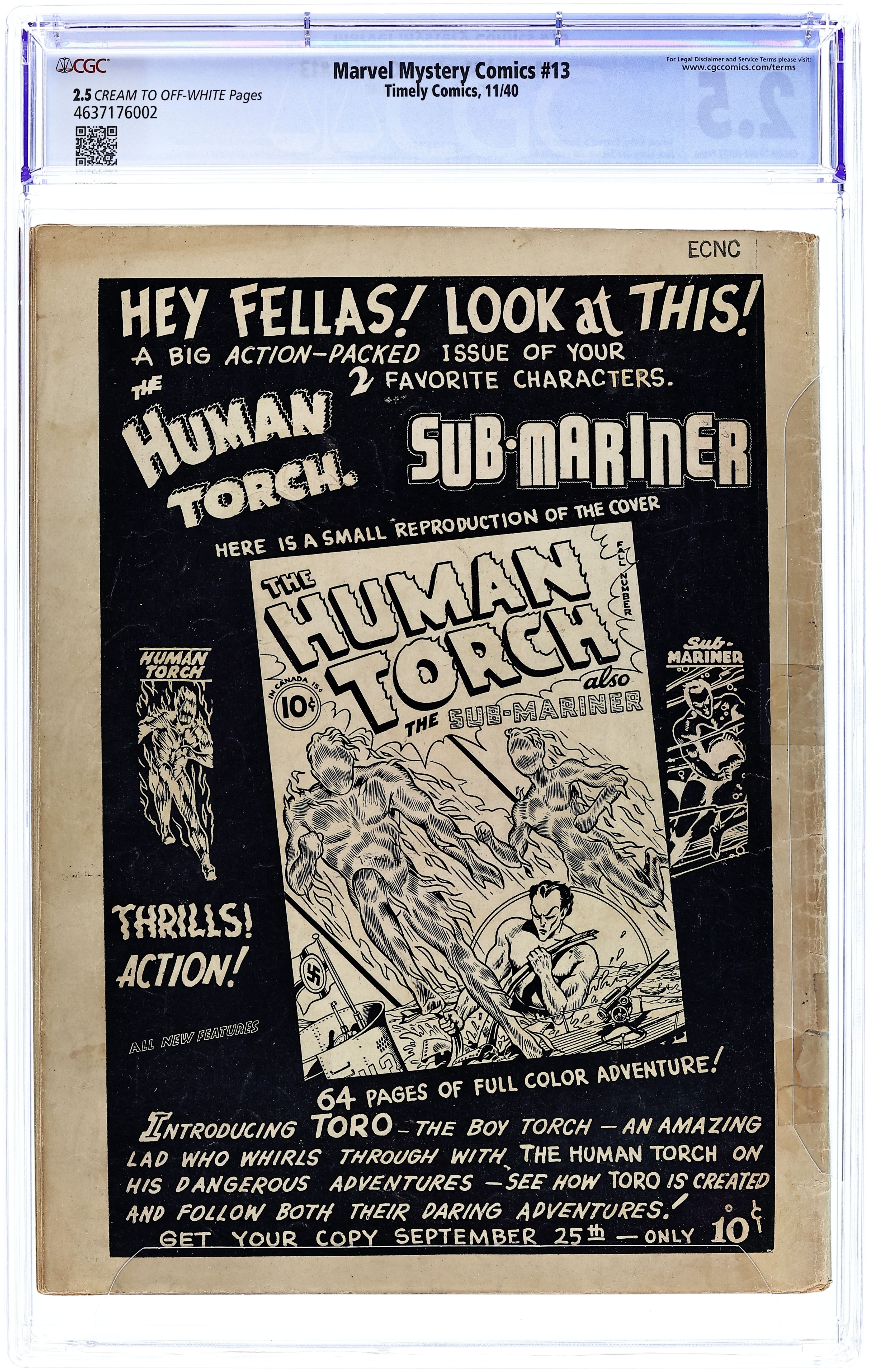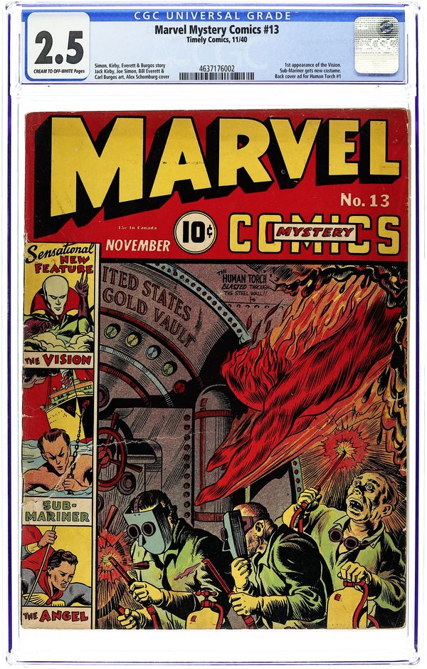 Cover art by Alex Schomburg. Cut-Throat Justice text story, art by Andrew McWhiney, art by Harry Ramsey. Human Torch untitled story, script and art by Carl Burgos; A subway builder loses both of his sons to cave-ins while constructing the tunnels, causing him to lose his mind and seek revenge, wanting to wreck trains so they wouldn't disturb his sons' graves within the tunnels' walls; But he is confined by those whom he hires to help him accomplish the task and the Torch must stop them or else! Sub-Mariner untitled story, script and art by Bill Everett; Namor and Dorma, outfitted in new suits designed to ward off poison gasses, and on their way to Europe to aide in the war efforts, stop off at an island for rest. But they find themselves not only under arrest, but under attack from the Nazis as well. The Vision untitled story, script by Jack Kirby and Joe Simon, art by Kirby; A professor, believing that ghosts and spirits actually inhabit worlds and universes that co-exist with our universe, is set upon by "Brains" Borelli's men during an experiment to prove his theory; The result is a being called Aarkus, Destoyer of Evil, drawn to the laboratory, which helps to save the professor and his daughter from harm. Terry Vance untitled story, script by Ray Gill, art by Bob Oksner; Terry's discovery of fresh paint on a supposedly vintage oil painting sparks the interest of Terry and his investigation nearly costs him his life. Electro, the Marvel of the Age untitled story, art by Steve Dahlman; The Professor and the Cranes leave Earth for the Moon, but when they send out Electro to investigate the environment, he is attacked and captured by moon robots; Zog and the Cranes land and initiate their own attack on the moon people and save the day. . The Angel untitled story, art by Paul Gustavson; The death of a former gang member of the Savoy mob who had chosen to go straight angers the Angel, and he swears to hunt down the men responsible for this death. Adventures of Ka-Zar the Great untitled story, art by Ben Thompson; Now in America, Ka-Zar is taken in by the police and escapes, but through the efforts of the Wilson's, is put into their custody. 68 pages. Cover price $0.10.
