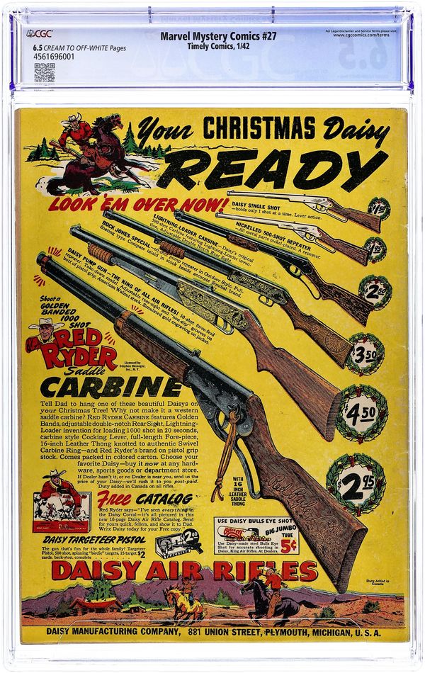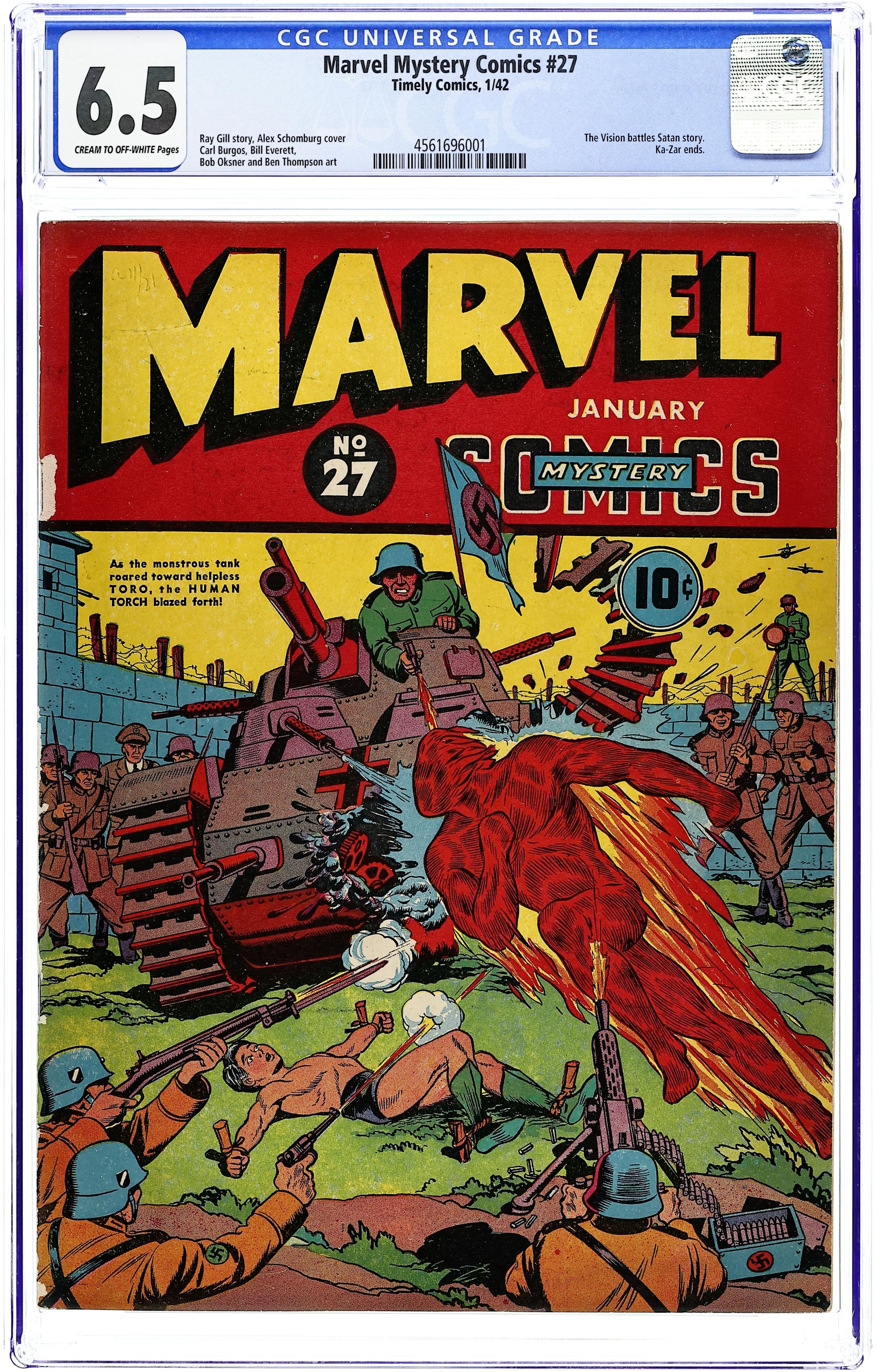 Cover art by Alex Schomburg. The Young Allies ad. "The Flaming Arrow Murders" starring The Human Torch, story and art by Carl Burgos; Torch and Toro must stop the criminal designs of The Saint, who, along with his gang, is out to steal the plans for a new super air tank that the Raleigh Corporation is building. Marvel Mystery Comics contest. Sub-Mariner untitled story, script and art by Bill Everett; Namor hears from a dock worker (aka "brush man"), who handles fur cargoes shipped in from Alaska, that no more shipments are being received and that the furs are somehow being smuggled in; Sub-Mariner investigates and discovers that The Fox is putting the stolen furs in torpedo-like metal tubes with motors and fires them into an underground river that leads to the United States. The Vision untitled story, script by Jack Kirby and Joe Simon, pencils by Kirby and David Walters, inks by Walters; Satan demands that his sales manager quit falling down on the job and see to it that the only evil-free city in the United States, Arbor City, is turned into a hotbed of evil and misery. "Quick Thinking, or, How Good a Detective Are You?" text story. "Voodini's Last Laugh From the Grave" starring Terry Vance, script by Ray Gill, art by Bob Oksner; The relatives of the late Professor Voodini gather at his mansion to listen to the reading of the will, whose contents lead to several murders and the re-appearance of the evil professor. "Death to Spies" starring Patriot, art by Ray Houlihan; Suoka has appointed a Filipino bolo wielder to murder Lt. Curtis, but the Patriot interferes and prevents the crime, finally tracking down the Japanese secret agent behind the murder plot. "Death Rings the Bell"; The Angel investigates weird deaths associated with the ringing of the carillon belonging to the late millionaire, Jonathan Brown. Ka-Zar the Great untitled story, script and art by Ben Thompson; Arriving in French Equatorial Africa, Ka-Zar is captured by the Nazis and used as a decoy to sucker French ships into submarine range. Human Torch Comics ad. 68 pages. Cover price $0.10.