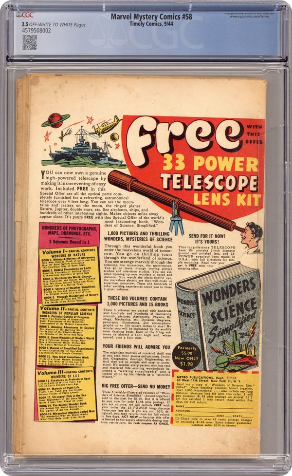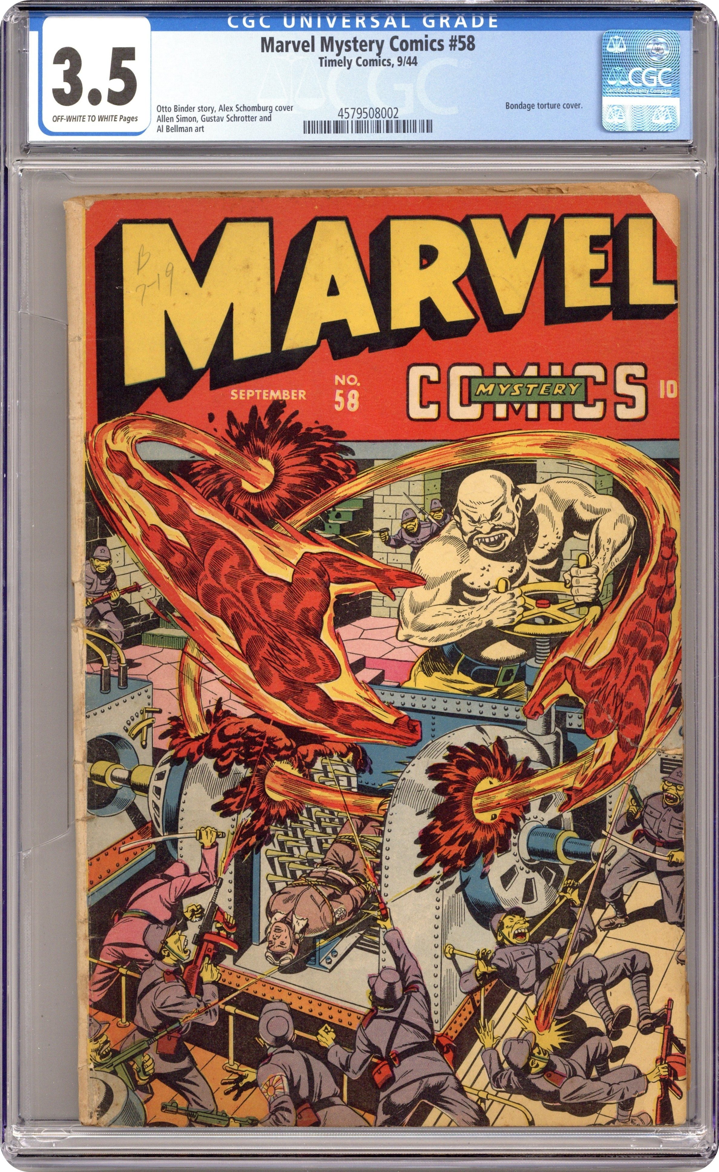 Cover art by Alex Schomburg. The Nazi Super Spy starring Human Torch, inks by Allen Simon. The Cult of Cannibals starring Sub-Mariner, art by Allen Simon. Black Widow starring Miss America, script by Otto Binder, art by Charles Nicholas. Hunch Drunk text story. Miss Liberty Takes a Hand starring Patriot, art by Al Bellman. Wanted: The Angel, art by Gustav Schrotter. 52 pages. Cover price $0.10.