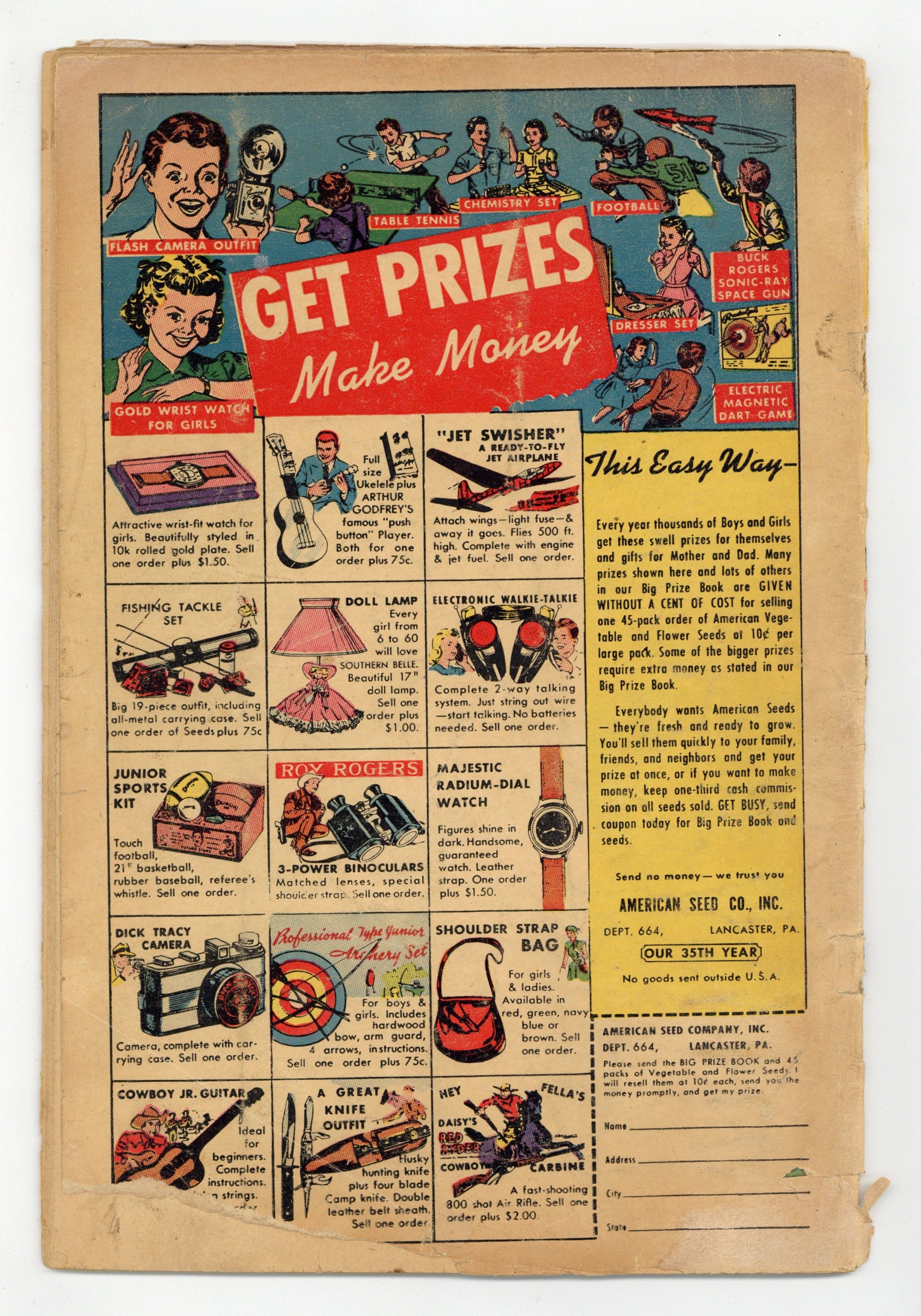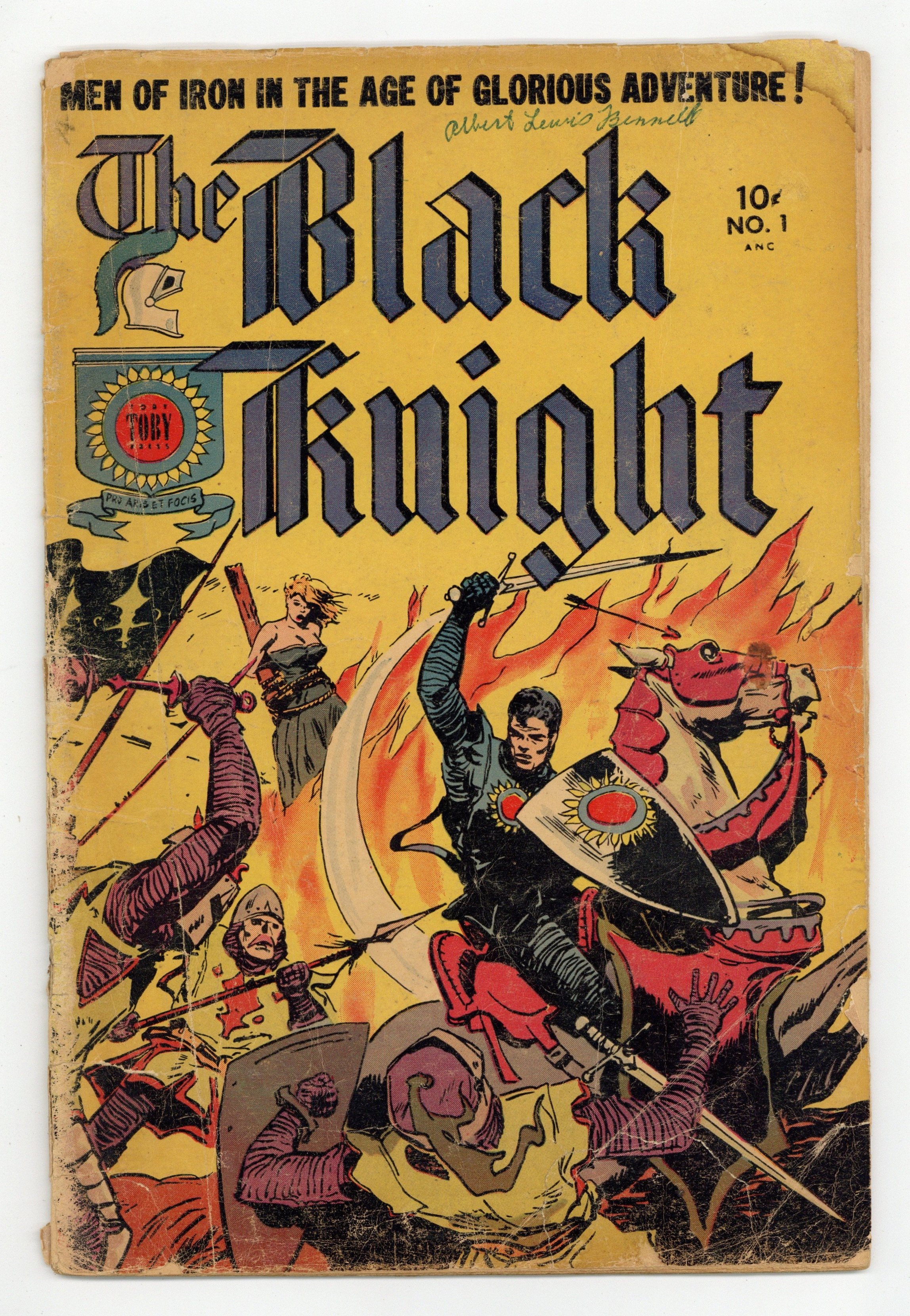 Cover by Ernest Schroeder. Stories and art by Mell Lazarus, Robert Bernstein and Ernest Schroeder. Medieval adventure featuring the wandering knight errant known as the Black Knight. The Black Knight battles an army to prevent a woman from being burned at the stake as a human sacrifice. The Black Knight searches for his missing friend, the Sheriff of Blisford, but he's vanished as if he never existed. Plus an early cartoon by Mell Lazarus, creator of the Momma and Miss Peach comic strips. Human Sacrifice; Old Liz; The Invitation. 36 pages, Full Color. Cover price $0.10.