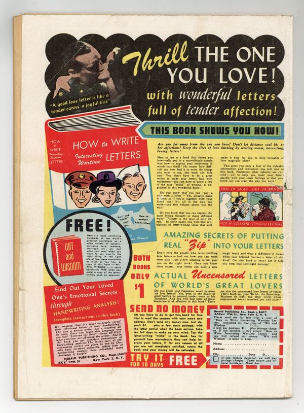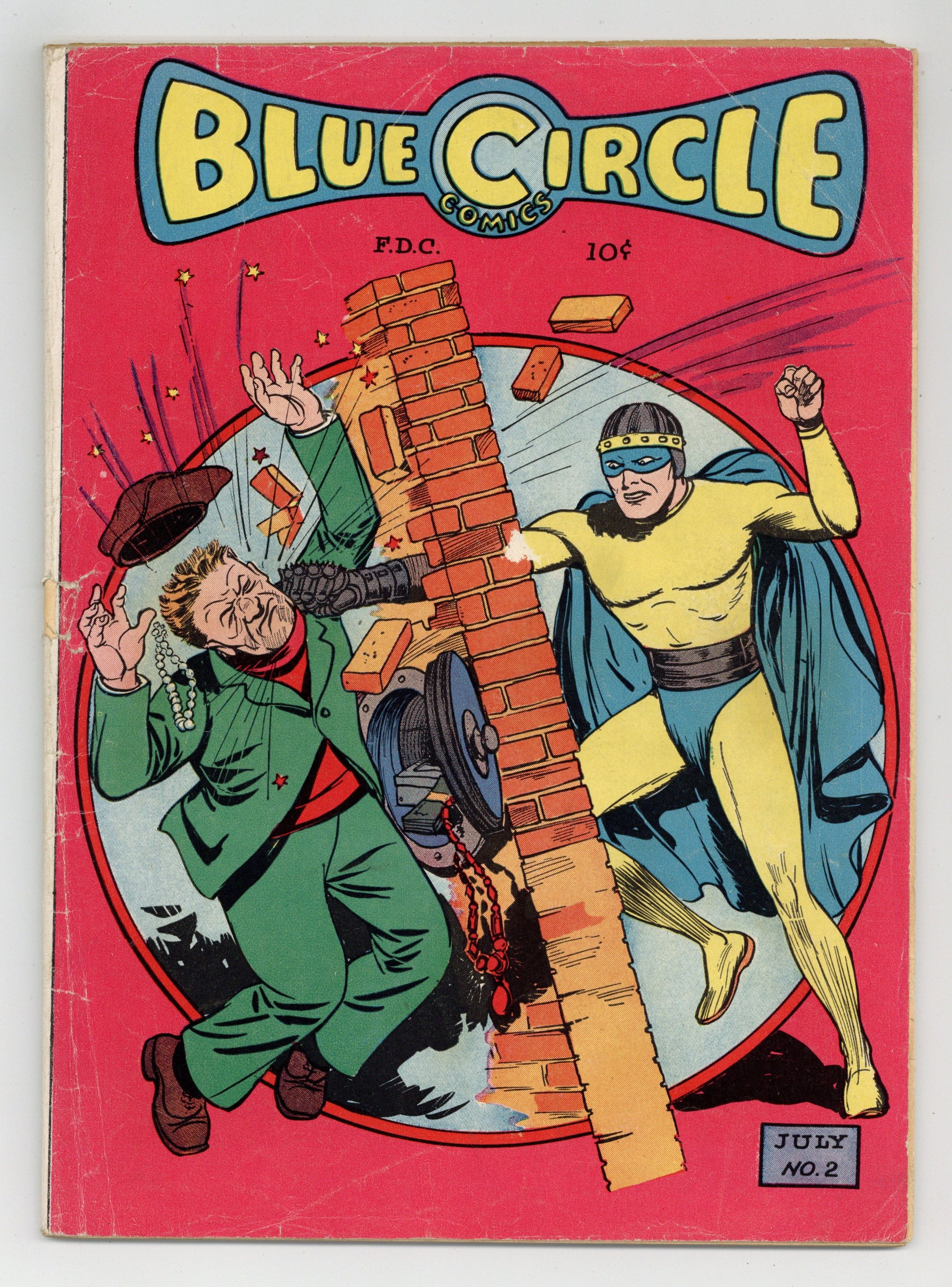 Stories and art by Bill Allison, Harold Delay, Jack Warren, and Henry Kiefer. Masked heroes face Axis forces in this WWII-era adventure series. In his civilian identity as a wartime production steelworker, Steel Fist witnesses fellow workers being hypnotized into sabotage by the music over the PA system. Maureen Marine has Little Nemo-like adventures as the new Queen of the kingdom under the sea, in a story with some lovely fantasy art by Harold Delay. In another story that's a sign of its times, Slaphappy Grandpappy tries to hire a maid, but all the nearby women are working in wartime production factories. Blue Circle; Gail Porter, Girl Photographer: Werewolf of Woonsocket; The Toreador; Maureen Marine; Driftwood Davey; The Steel Fist: Music Madness; Dangerous Pay; Slaphappy Grandpappy. 52 pages, Full Color. Cover price $0.10.