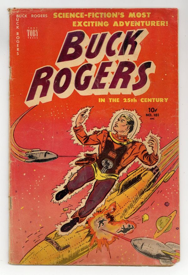 Stories and art by Murphy Anderson, Ray Chatton and Vic Herman. Sometimes listed as Buck Rogers #8. Toby Press presents reprints of the classic Buck Rogers comic strip from 1947-1949. Buck is sent back in time to 1951 to end a communist revolution in Austria. But 25th-century history records Buck being killed in 1951 by the beautiful but deadly Alga and her Servian revolutionaries. Nerdy boxer Kid Science solves a mystery with his brains and his fists. The Brink of Disaster; The Mystery of the Flamingo Feather; The Case of the Bullet in the Leg; Kid Science: The Pug With the Perfect Profile. Actually the second issue published; followed by Buck Rogers (1951 Toby Press) #9. 32 pages, Full Color. Cover price $0.10.