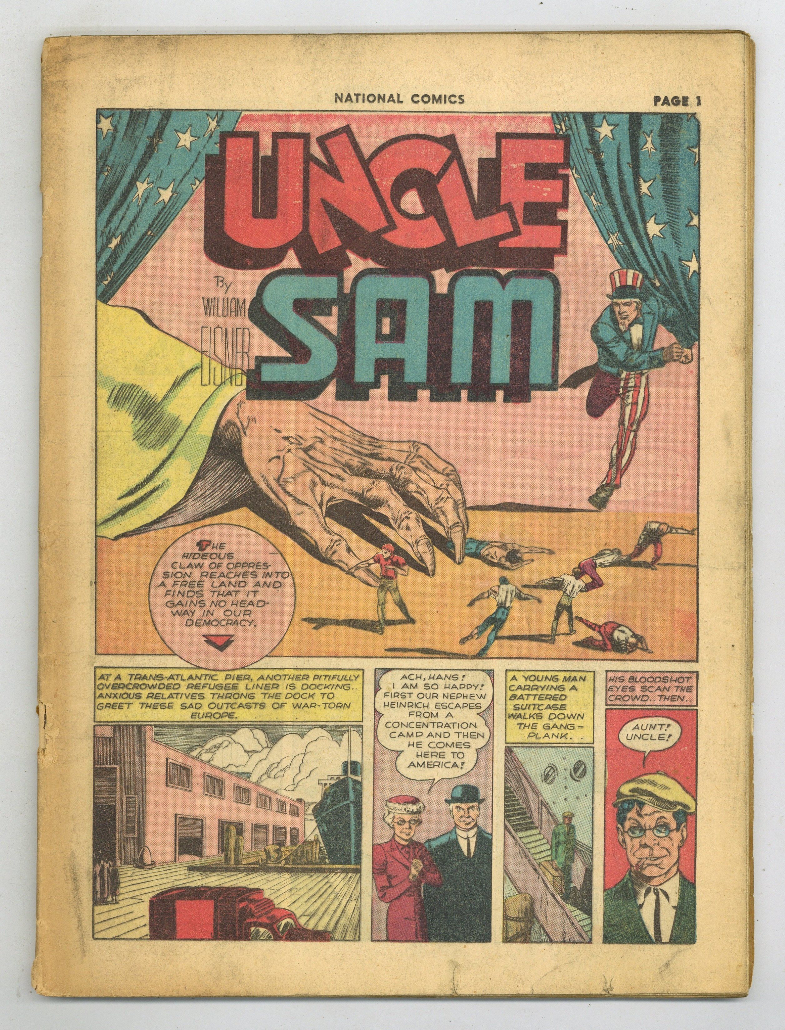 Cover art by Lou Fine. Untitled stories starring Uncle Sam, Sally O'Neil Policewoman (script by Toni Blum, art by Chuck Mazoujian), Windy Breeze (script and art by Jack Cole), Wonder Boy (script by Toni Blum, art by Hank Larson), Prop Powers (art by Clark Williams), Ken Dixon (script by Klaus Nordling), Quicksilver (art by Nick Cardy), Miss Winky (script and art by Arthur Beeman), Kid Patrol (art by Charles Nicholas), Jack and Jill (art by Al Bryant), Pen Miller (script and art by Klaus Nordling), Paul Bunyan (art by Reed Crandall), and Merlin. 68 pgs. $0.10. Cover price $0.10.