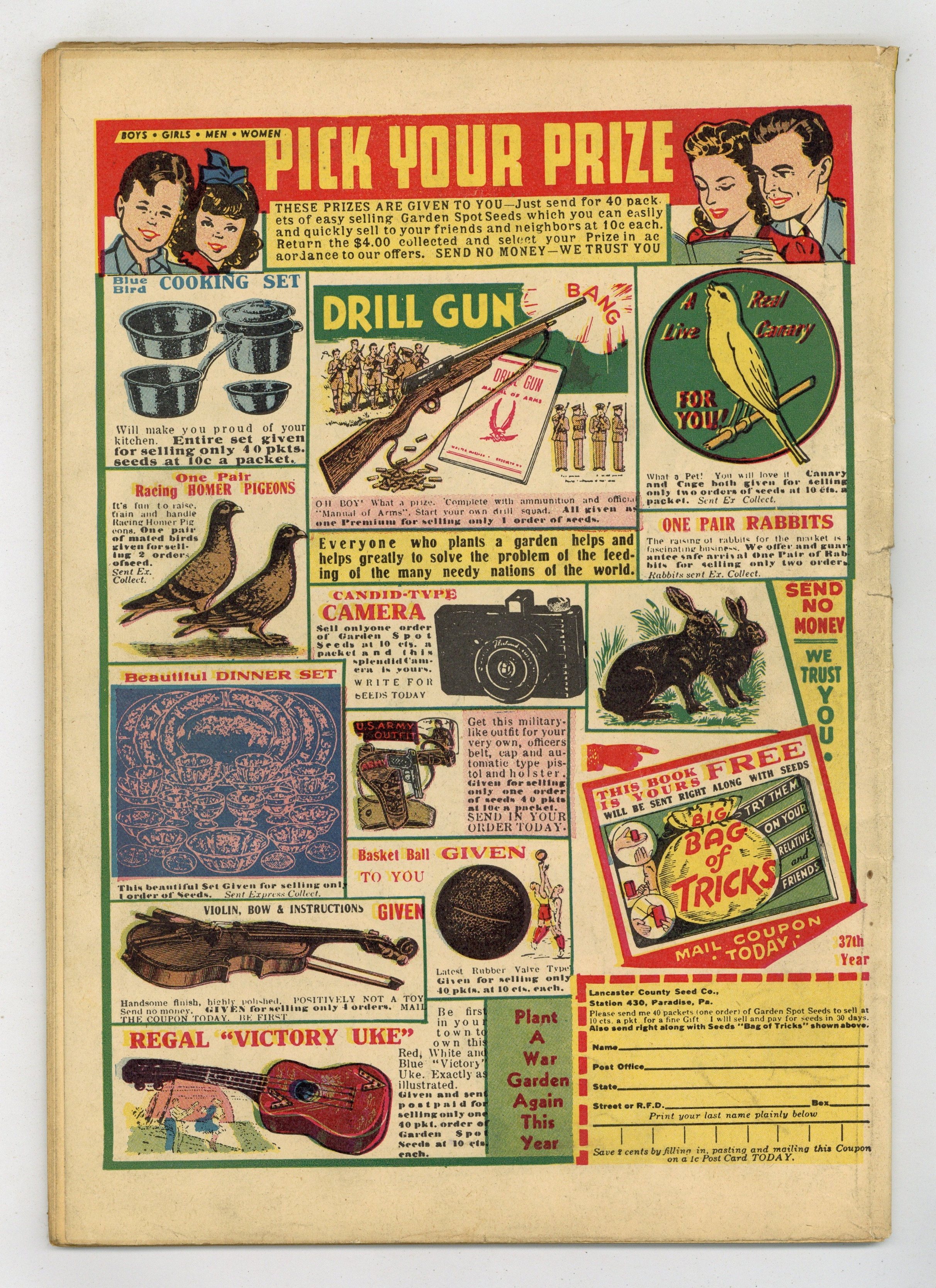 Cover by Rojo. Stories and art by Art Moore, Dave Abel, Dick Wood, R. W. Hall, and Basil Wolverton. Kids' comics featuring early work by Basil Wolverton. Monsooer Muskrateer is bored; Scoop Scuttle encounters Lester Fussfester, in a story by legendary cartoonist Basil Wolverton. Circus Life is a continuing text feature about the workers in King Brothers Circus. Eggbert; Mopey Moose; Scoop Scuttle; Circus Life; Dumb Like a Fox; Buster, The Scrap-Happy Little Plane; Little Bo Pig; Monsooer Muskrateer. Final issue of the series. 48 pages, Full Color. Cover price $0.10.