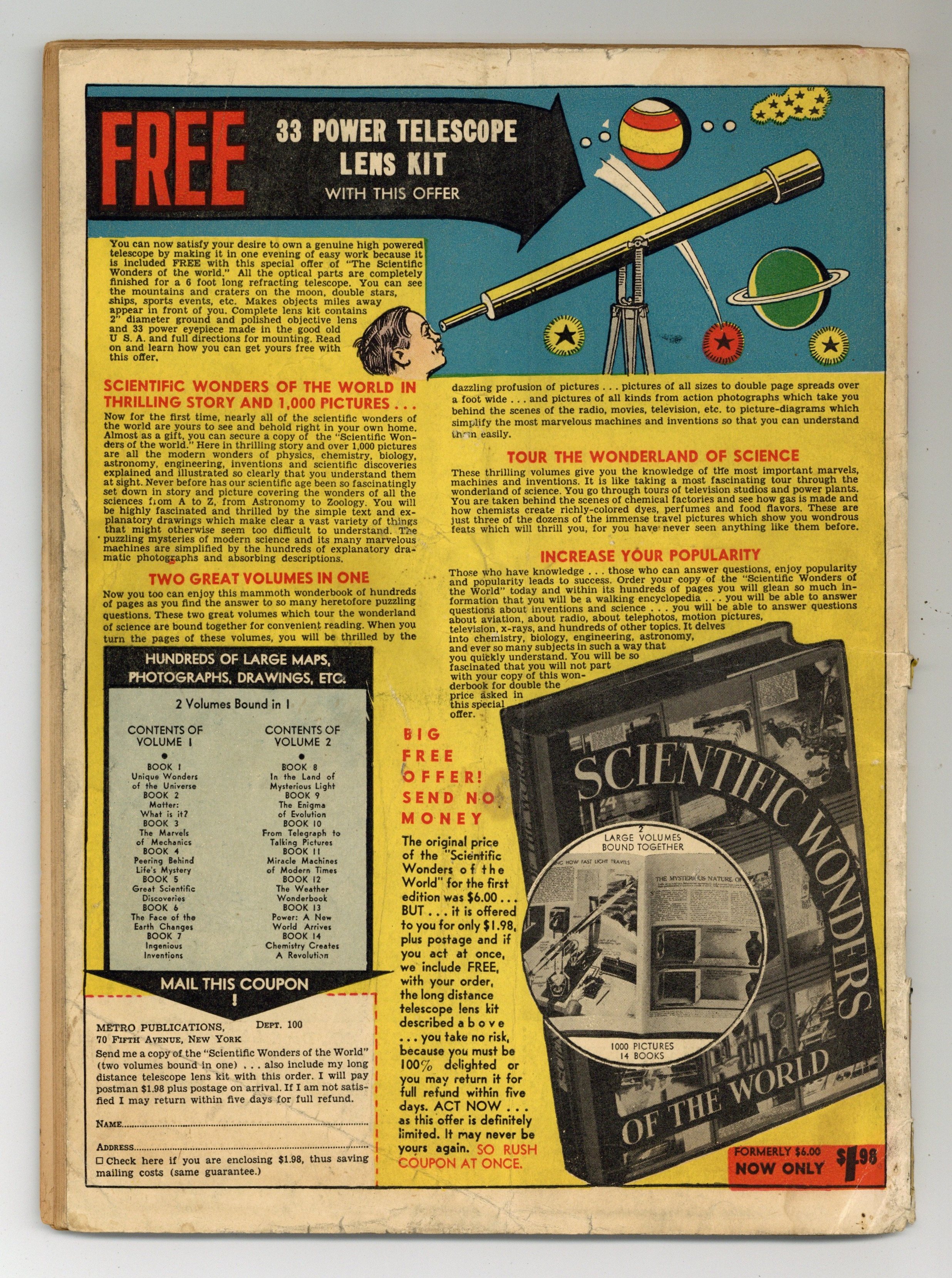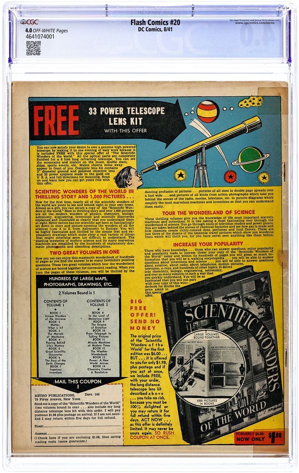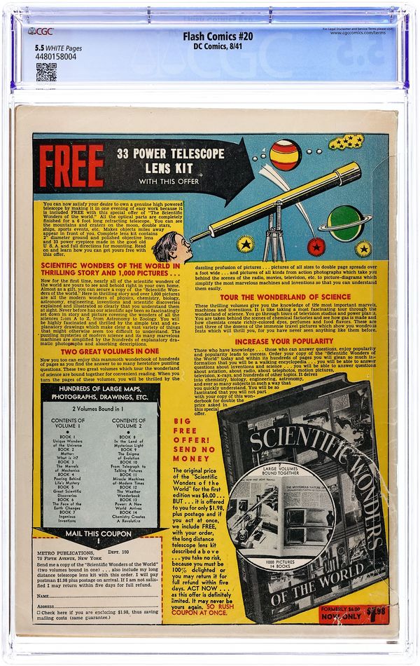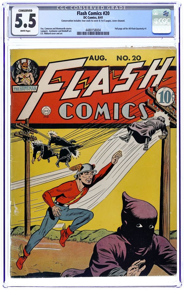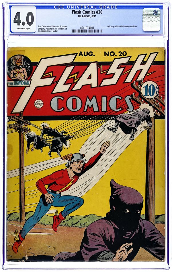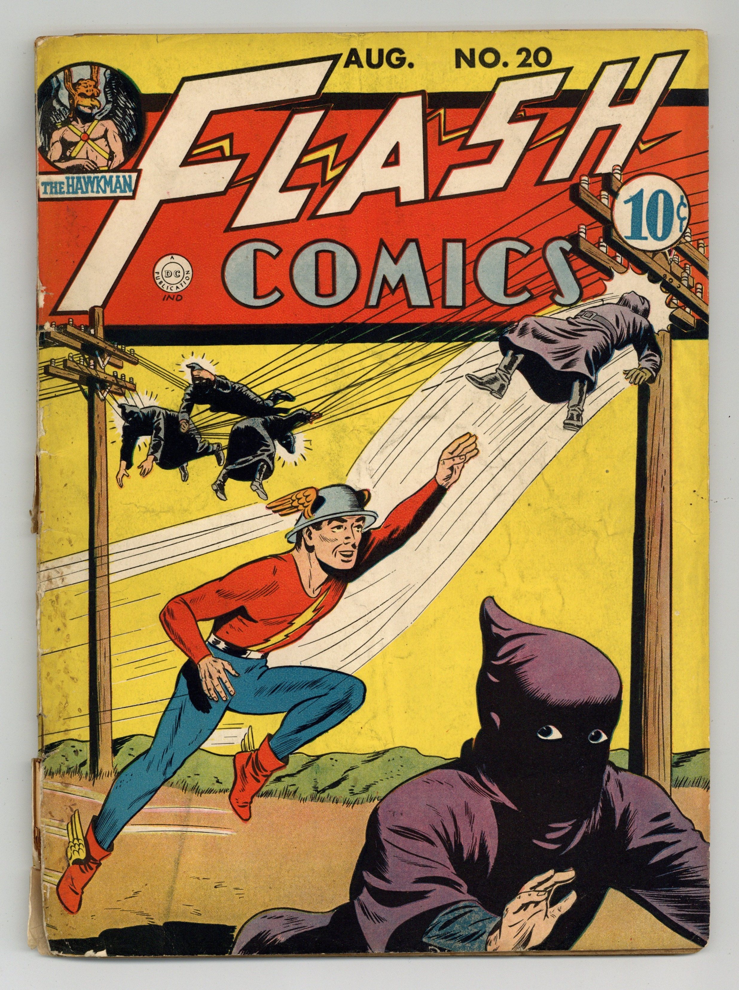 Flash stars in "The Adventure of the Auctioned Utility Company," written by Gardner Fox, art by Harold Wilson Sharp. Also includes: Les Sparks, Radio Amateur in "The Adventure of the Harbor Day Invasion" by Don Cameron; Johnny Thunder in "The Fake Accident" by John B. Wentworth and Stan Aschmeier; The Whip in "In New York" by Wentworth and Homer Fleming; King in "The Witch's Double" by Fox and Harry Lampert; Cliff Cornwall in "Duty in the Canal Zone" with art by John Ayman; "The Hazards of Hazel" by Ed Wheelan; and Hawkman in "The Mad Bomber" by Fox and Sheldon Moldoff. Cover art by Everett E. Hibbard. 68 Pages, Full Color. Cover price $0.10.