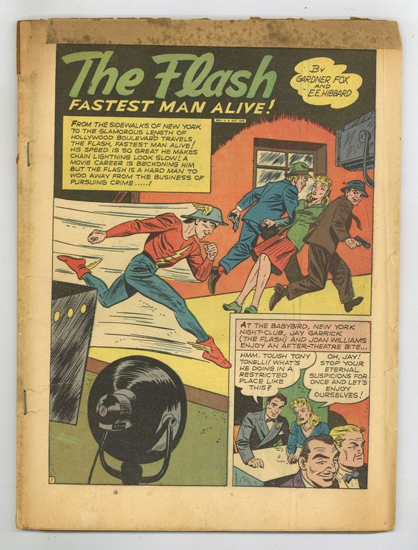 Flash stars in "Flash Goes to Hollywood," written by Gardner Fox, pencils by Everett E. Hubbard, inks by Harold Wilson Sharp. Also includes: Les Sparks, Radio Amateur in "The Costume Brawl" by Don Cameron; Johnny Thunder in "Peachy Pet's Plane Ride" by John B. Wentworth and Stan Aschmeier; The Whip in "Uncle Sharp" by Wentworth and Homer Fleming; King in "The Witch" by Fox and Harry Lampert; "Masquerade Mystery" by Ed Wheelan; and Hawkman in "The Mechanical Master" by Fox and Sheldon Moldoff. Cover art by Everett E. Hibbard. 68 Pages, Full Color. Cover price $0.10.