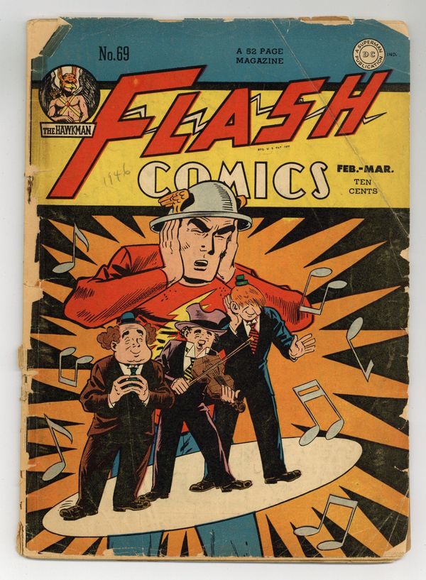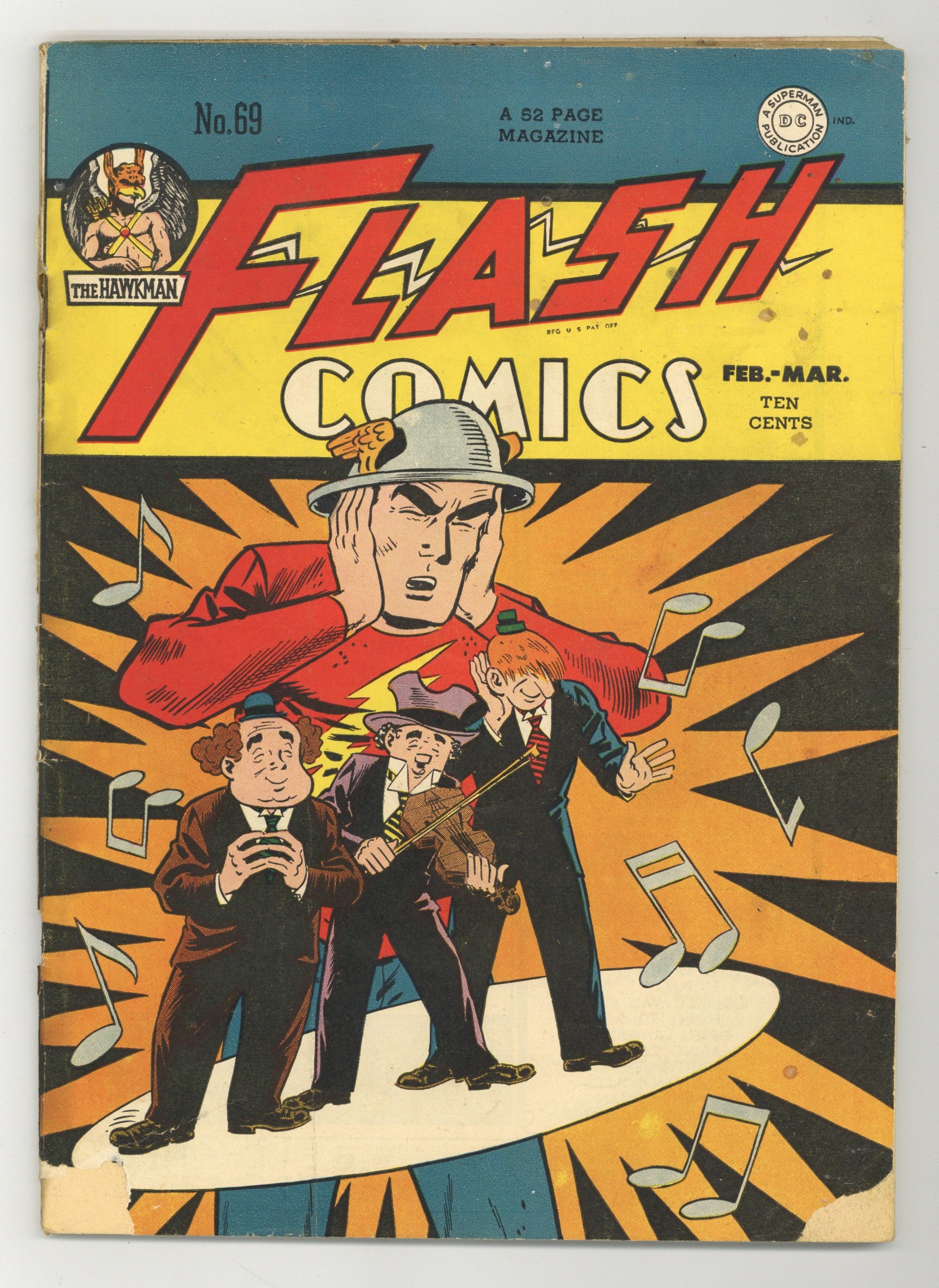 Flash stars in "Adventure of the Violent Violin," written by Gardner Fox, art by Everett E. Hibbard. Also includes: Ghost Patrol in "The Arabian Djinn" by John B. Wentworth and Frank Harry; Johnny Thunder in "Peachy and Shocko" by John B. Wentworth and Stan Aschmeier; Ton o' Fun by Harry Lampert; and Hawkman in "The Flaming Curse" by Fox and Joe Kubert. 52 Pages, Full Color. Cover price $0.10.